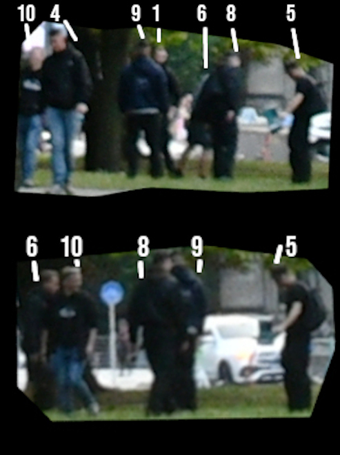 Am 22.7. versuchten Neonazis vom III. Weg Teilnehmenden vom CSD bei der Abreise in Berlin-Mitte aufzulauern. Unter der gewaltbereiten Gruppe befanden sich Erik Storch (1), Luca Böttcher (2) und Franz-Richard Schrandt (7). Neben der, teilweise mit Glasflaschen bewaffneten, Kerngruppe gab es mindestens zwei abgesetzt laufende Späher, die die Aktion absichern sollten (unter anderen Nummer 5).