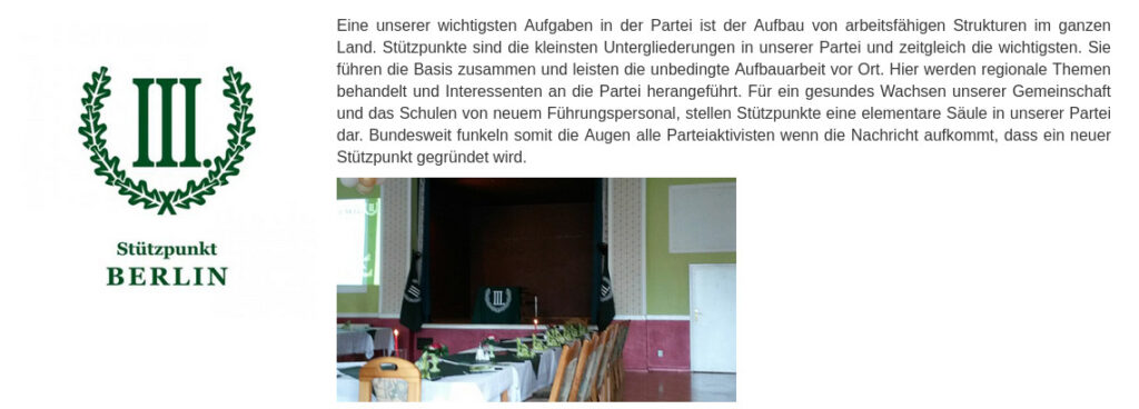 Laut eigenen Aussagen gründete sich der Berliner Stützpunkt vom „III. Weg“ am 29.03.2015. Die Bilder der Veranstaltung wirken sehr offensiv. Fahnen und Banner mit dem Parteilogo werden offen zur Schau gestellt. Probleme scheinen die Neonazis nicht zu befürchten. Nach Recherchen vom „Antifaschistischen Monitor Berlin“ fand die Gründung in den Räumen vom „Mittelpunkt der Erde“ statt.