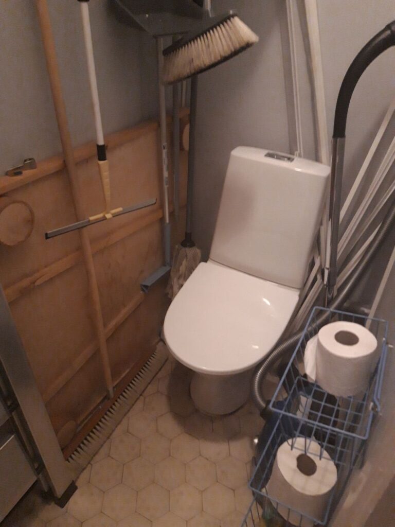 Inside the house there is one small toilet. Door frame is 58 cm wide and threshold 5 cm high. Space between the toilet seat and door is 50 cm, width 68 cm. The toilet is gender neutral.