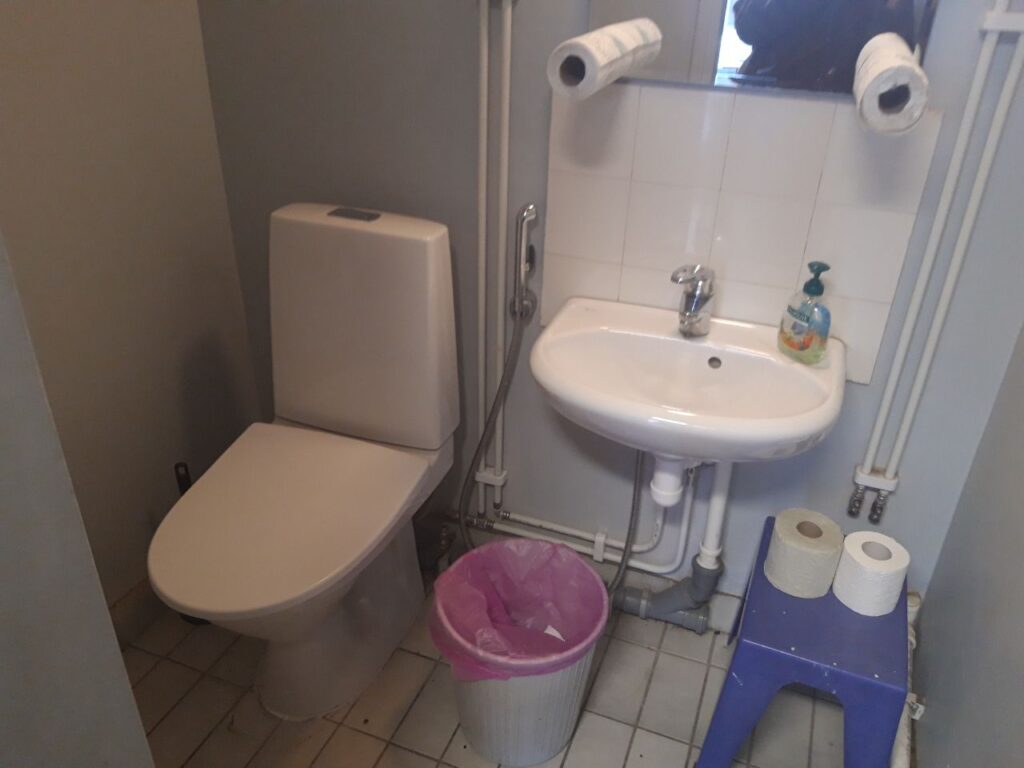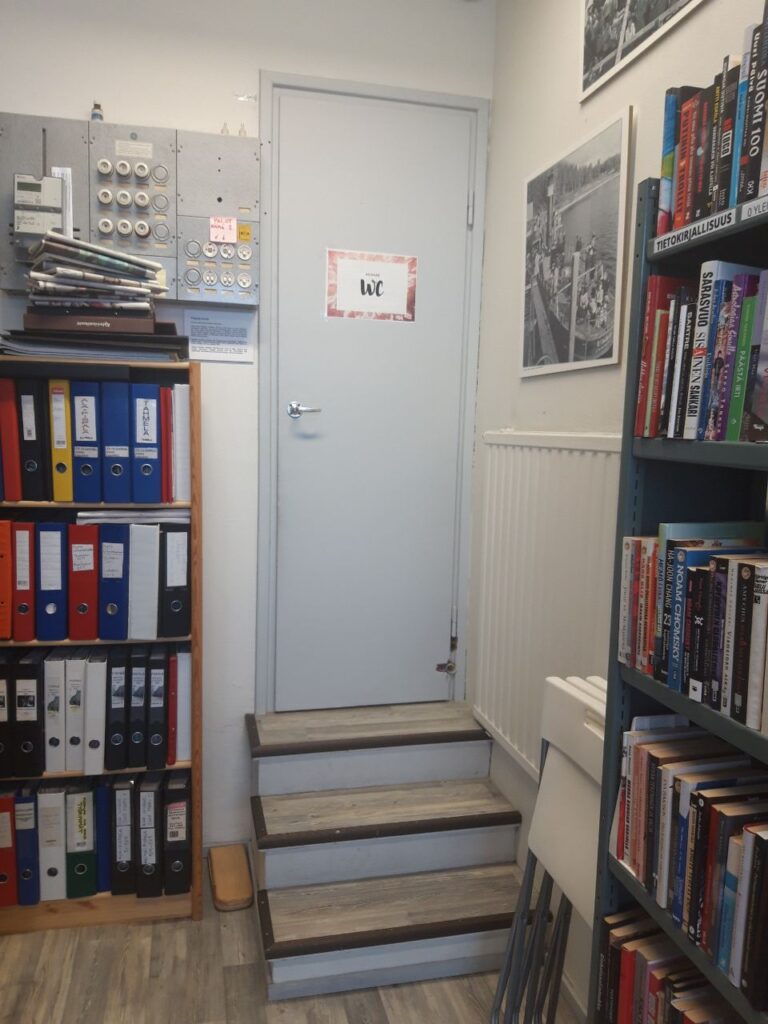 The staff toilet can be used if the stairs are an obstacle to using another toilet. There are no thresholds or steps to the bathroom, but the entrance is behind three narrow doorways, the width of the doorways is 58 cm. After the first doorway, the next opening is 90 degrees to the left, and the turn happens in a rather small kitchen.