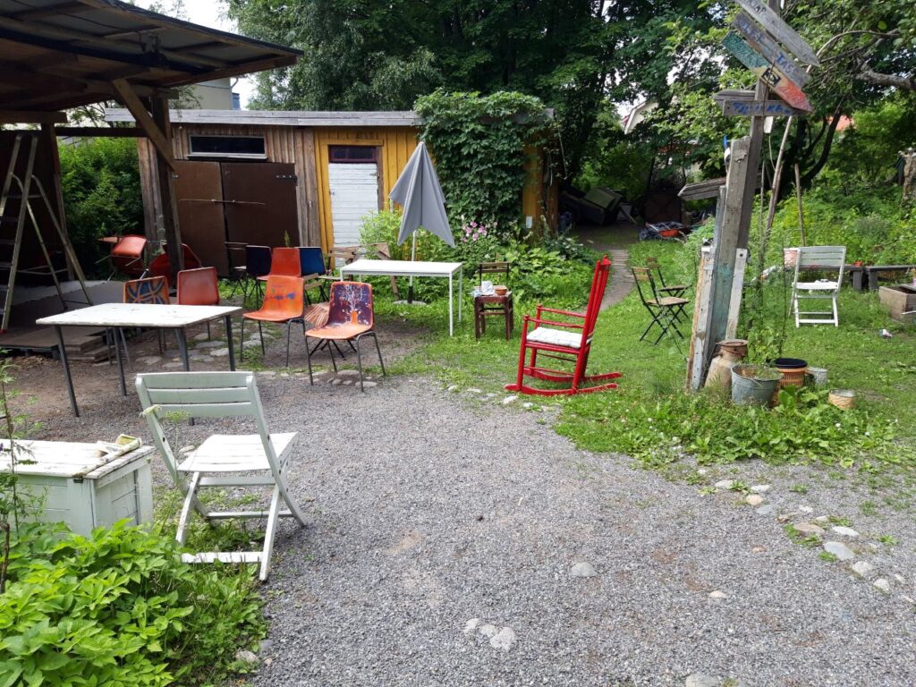 Sisällä huoneiden välissä on 3 cm kynnykset, oviaukot ovat 80cm leveät. Sisällä on tuoleja, joissa on selkänoja.