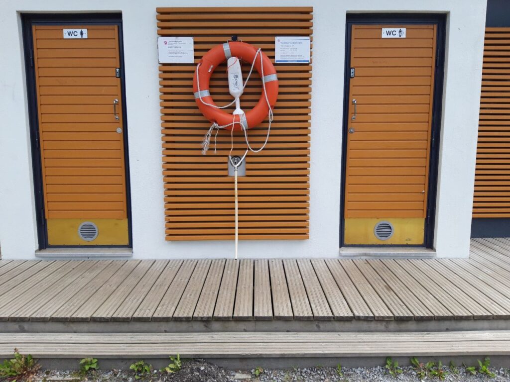 WC:hen mentäessä on kaksi porrasta, 17cm ja 20cm. Vasemman puoleisessa WC:ssä on kaksi 67cm x 100cm koppia, sekä niiden edessä käsienpesutila. Kopit saa hakasella kiinni.