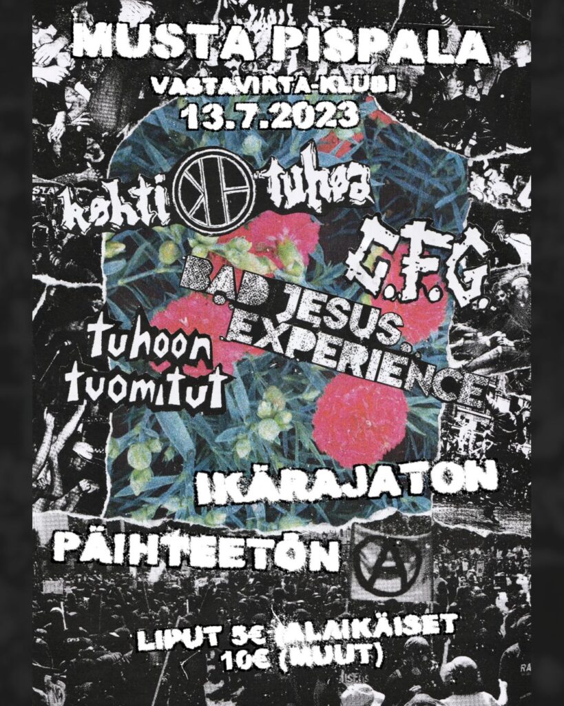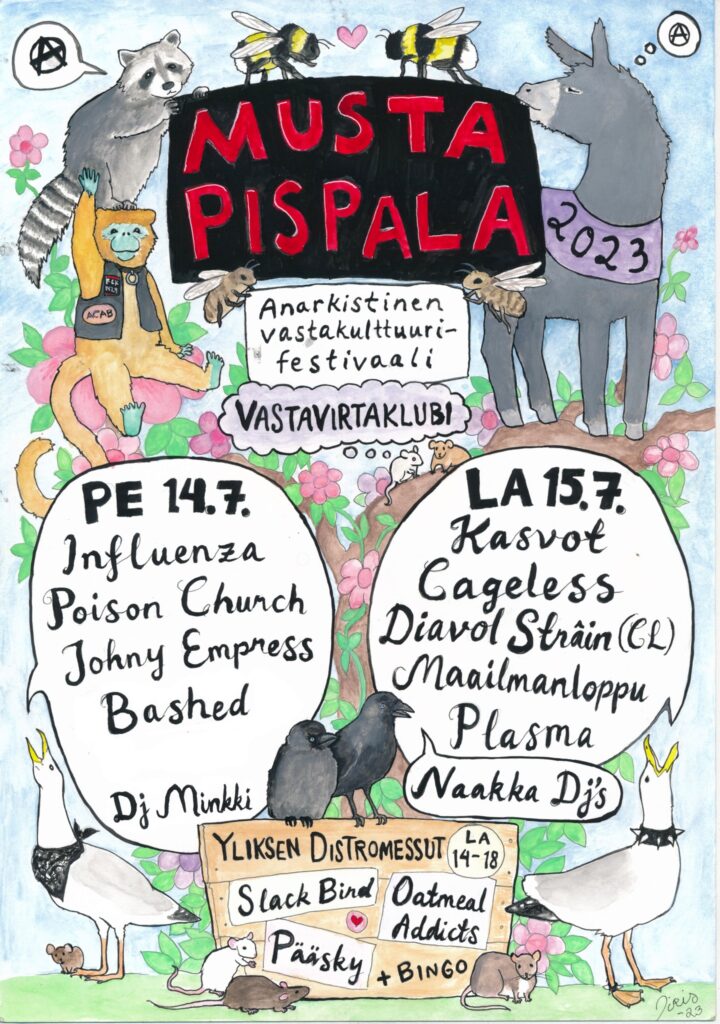 Anarkistinen vastakulttuurifestivaali Musta Pispala levittäytyy jälleen ympäri Pispalaa ja kaupunkia työpajoineen, keskusteluineen ja keikkoineen 13.-16.7.2023 (Ohjelma kokonaisuudessaan julkaistaan myöhemmin).