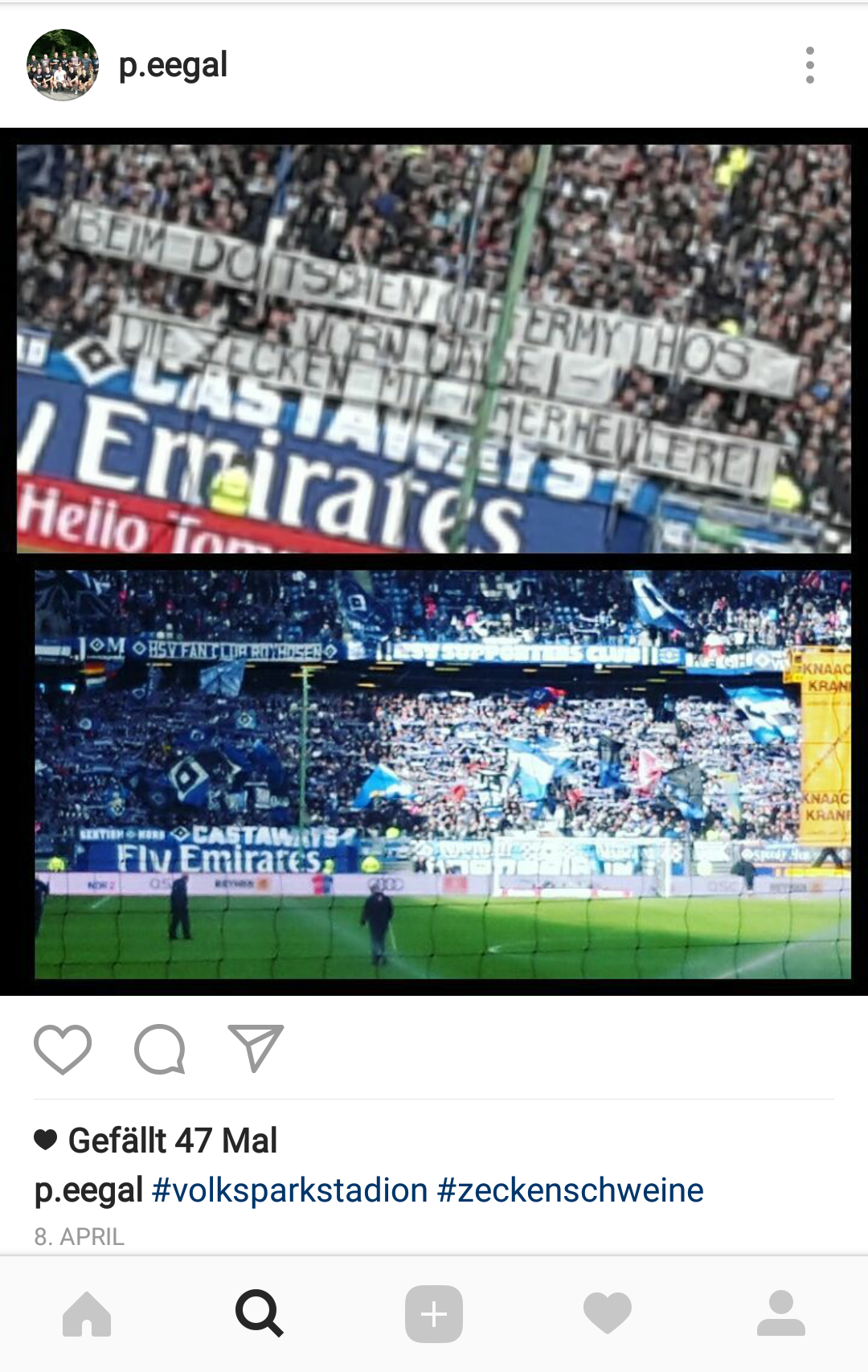 Auch auf seinem Instagramprofil lässt er gern seine rechte Gesinnung verlautbaren. So kommentiert er ein linkes Spruchband von HSV-Fans mit „Zeckenschweine“.