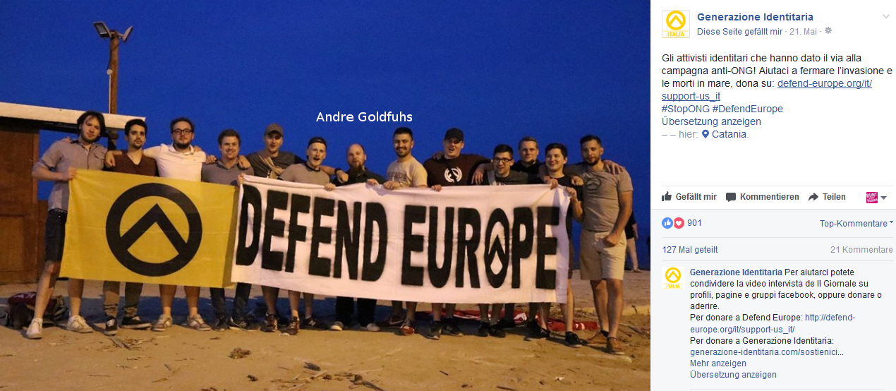 Der Handwerker und Hobbywanderer André Goldfuhs aus Sarstedt ist Mitglied der Identitären Bewegung. In jüngeren Jahren war André in der niedersächsischen Neonaziszene aktiv und besuchte Rechtsrockkonzerte von und für Faschisten. So war er zum Beispiel am 21.08.2010 auf einem Konzert der extrem rechten Band Oidoxie, welches vom Mindener Neonazi Marcus Winter auf dem Hof Nahtz bei Eschede organisiert wurde.Neben Demonstrationen und Aktionen der Identitären Bewegung, beteiligte sich Goldfuhs auch an der Kampagne "Defend Europe" der Identitären Bewegung. Am 12. Mai 2017 haben Mitglieder der IB, darunter Führungskräfte wie Martin Sellner (Wien), Clement Galant (Frankreich) oder Lorenzo Fiato (Italien), auf der italienischen Insel Sizilien das Rettungsschiff Aquarius der Seenotrettungs-NGO "SOS Méditeranée" beim Auslaufen gestört. Andre Goldfuhs war Teil des "Defend Europe"-Teams, welches mehrere Tage auf Sizillien die Kampagne und die Aktion vorbereitete.