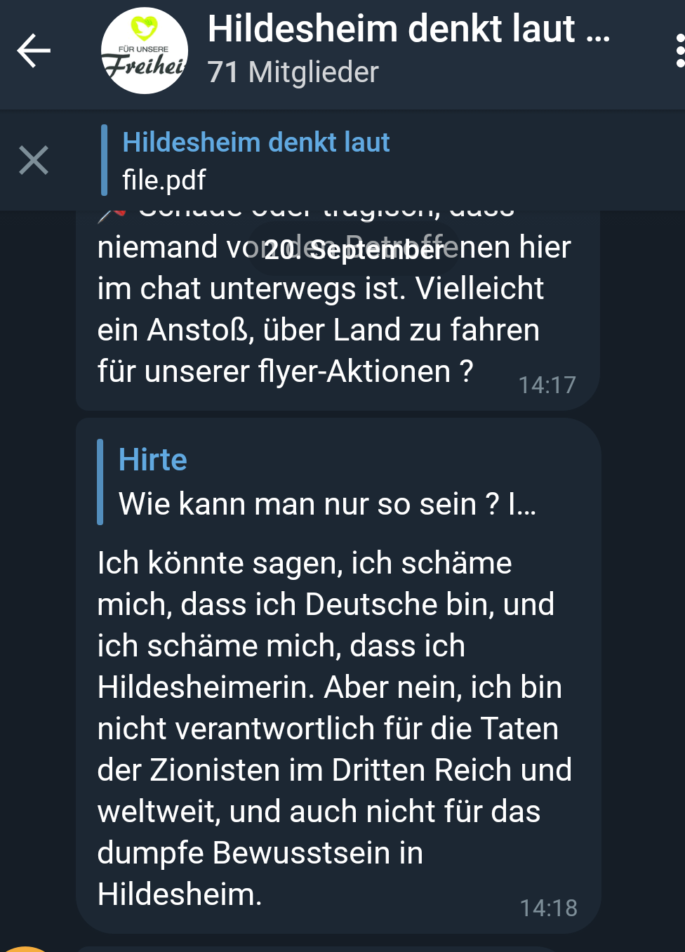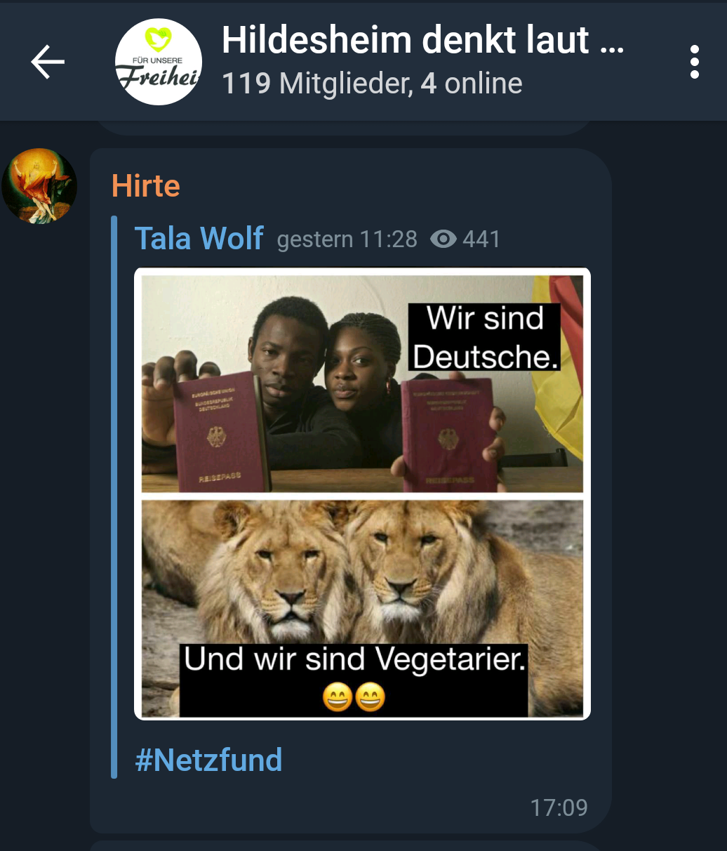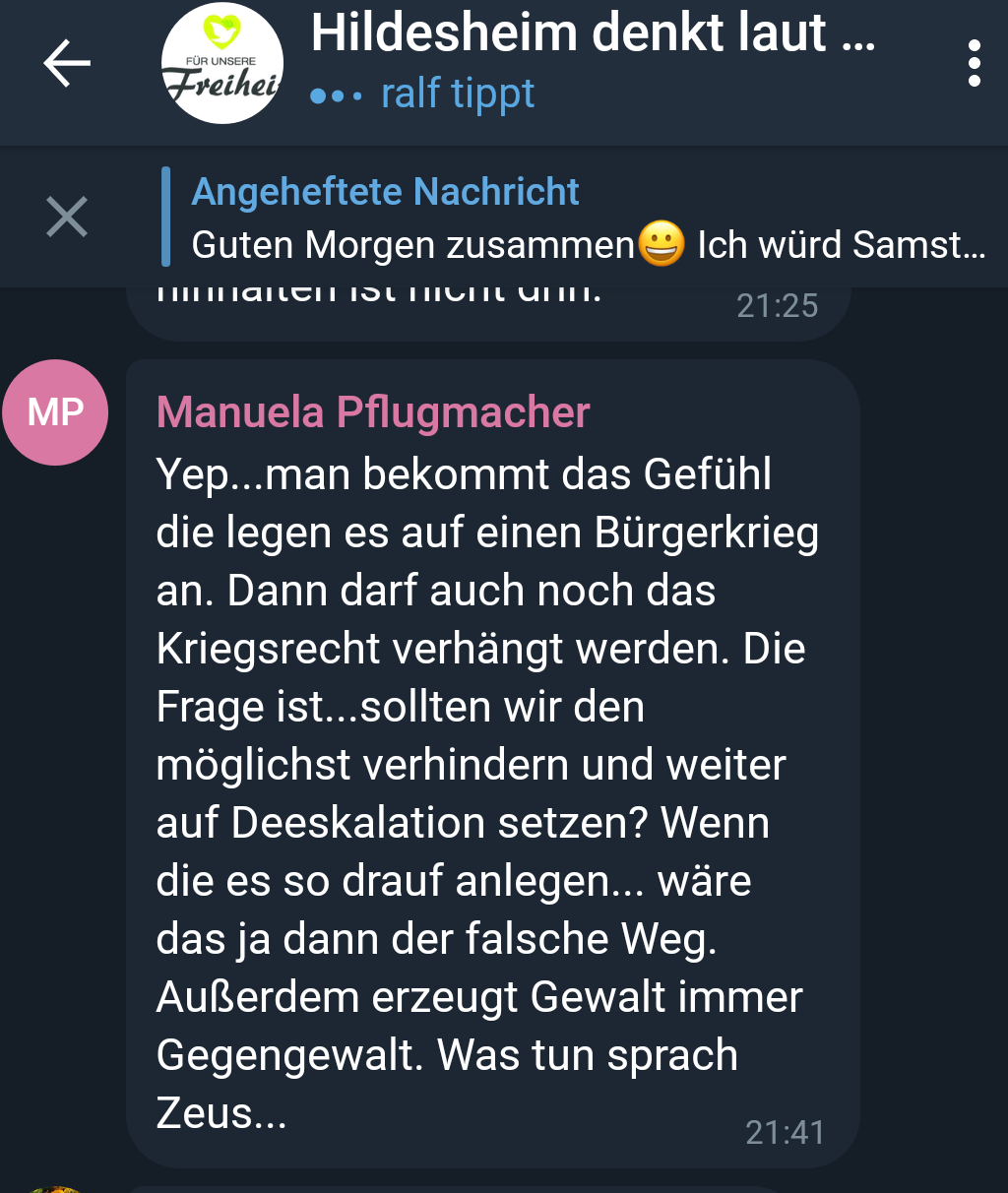 Die Gruppe hat eine gefestigte und funktionierende Orgastruktur und eine Infrastruktur mit Fahrzeugen, Schildern, Kameras und Propaganda, die es ihnen ermöglicht weiterhin ihren Aktivitäten nachzugehen. Seit Beginn der Querdenken Bewegung in Hildesheim im Jahr 2020 haben sich die Teilnehmer*innen immer weiter radikalisiert. Mittlerweile finden sich hier eindeutig nicht mehr nur rechte, sondern klar rechtsextreme Inhalte sowohl in internen Telegramgruppen als auch auf ihren Demonstrationen. Immer wieder laufen auch organisierte Neonazis bei den Aufmärschen in Hildesheim mit.