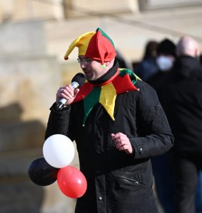 Ralf Jaskloh fällt schon seit Längerem durch sein aggressives Verhalten auf. Schon vor einigen Jahren attakierte er junge Aktivist*innen im Gegenprotest mit einer Metallstange. Mittlerweile zeigt sich seine rechte Gesinnung auch durch Aufkleber und Sprüche immer deutlicher.