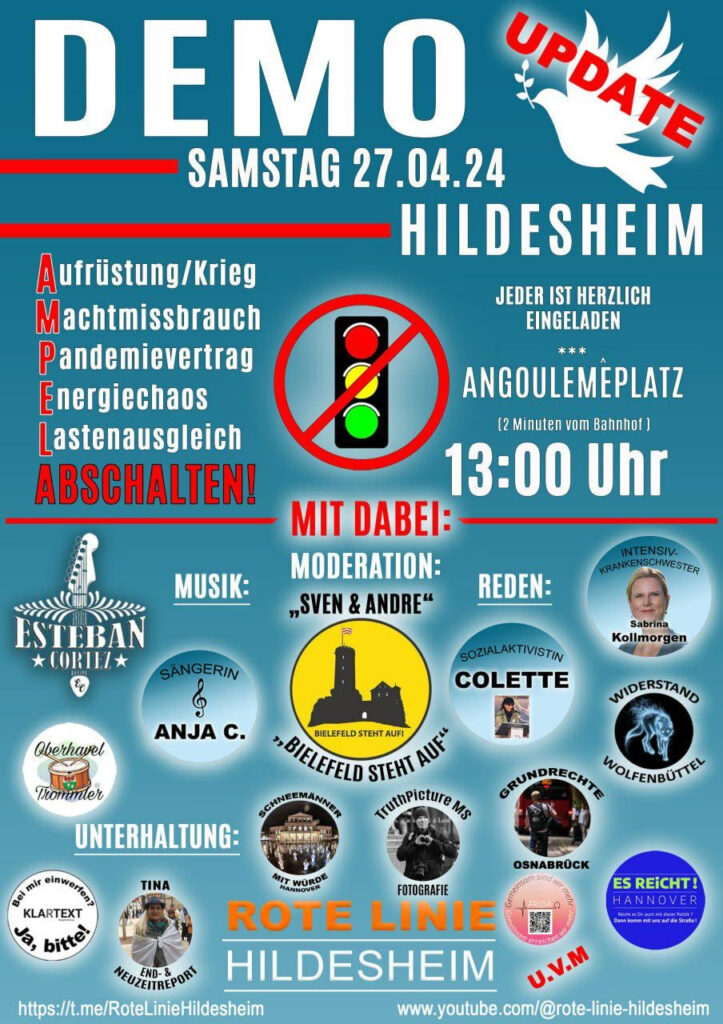 Die Versammlung beginnt um 13 Uhr am Angoulemeplatz unweit des Hildesheimer Hbf. Es können zwischen 200-400 Personen erwartet werden, die nach der Auftaktkundgebung einen sehr langen Marsch durch die Stadt veranstalten werden, eine genaue Route ist noch nicht bekannt. Die Moderation soll von „Sven und Andre (Bielefeld steht auf)“ gemacht werden. Mehrere Trommelgruppen wie die extrem rechten „Oberhavelner Trommler“ sind zu erwarten. Als Highlight auf der Bühne wird der Musiker Esteban Cortez beworben. Bei der letzten Veranstaltung traten auch vereinzelt Neonazis in Erscheinung. Außerdem sind mehrere Fotograf*innen angekündigt, die sicherlich auch versuchen werden den Gegenprotest abzufilmen.