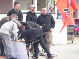 Rechts im Bild mit „Die Rechte Hildesheim“ T-Shirt und Schwarz-Weiß-Roter Fahne – Tim Höffner. Außerdem v.R. Lisa „Erwin“, Daniela Bliesener, Jens Wiedemann, Dominic Weidner, Martin Schüttpelz