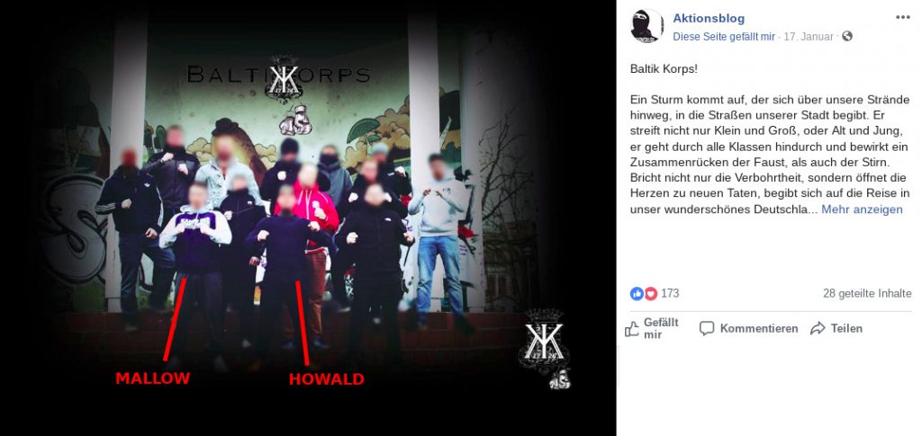 Nicht erst seit der Teilnahme an vergangenen AfD-Demonstrationen in Rostock sind David Mallow und Guido Howald durch rechte Aktivitäten aufgefallen. [4] David Mallow gilt als einer der Kernmitglieder des Neonazinetzwerks „Aktionsblog“ (AKB), das vorwiegend im Raum Rostock und zunehmend auch Güstrow aktiv ist, wo Mallow mittlerweile auch lebt. David Mallow machte zuletzt als neues Aushängeschild der neuen europäischen Nazi-Kampfsport-Bewegung von sich reden [Artikel]. Im Laufe der letzten Jahre trat er mehrmals für das Team „Kampf der Nibelungen/ White Rex“ als Wettkämpfer in den Ring. Auch in anderen Zusammenhängen steht David Mallow für seine menschenverachtende Ideologie ein. So fungierte er beispielsweise als Ansprechperson für den „Aktionsblog“ auf dem Schild und Schwert- Festival im Herbst 2018. [5] Auch Guido Howald ist kein Unbekannter. Seit 2018 taucht Howald nachweislich bei internen Veranstaltungen des Neonazinetzwerks „Aktionsblog“ auf und scheint sich diesem auch zugehörig zu fühlen. Neben David Mallow nahm Howald auch an der ersten gemeinsamen Trainingseinheit des nach eigener Aussage neuen „sportlichen Flügels“ des AKB teil, welcher Kampfsport für Neonazis im Raum Rostock und Güstrow propagiert. Trainiert wurde erneut in einem Güstrower Sportraum. [6-9]