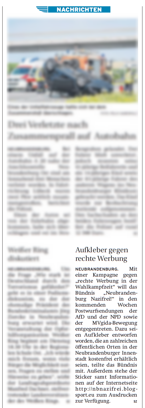 Der Nordkurier und auch die junge Welt haben ebenfalls berichtet und damit auch alle Interessierten wissen wo sie unsere Aufkleber finden können, hier eine erste Übersicht: