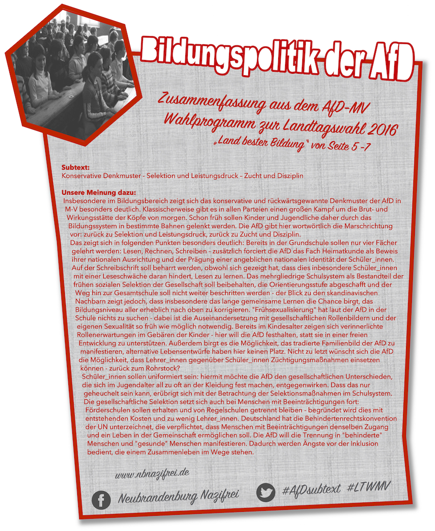 Von AfD-Kandidaten mit Kontakten zur rechtsextremen Szene bis zur Teilnahme an Neonazi-Aufmärschen erfahren wir hier mehr. In die gleiche Kerbe schlägt der Informationsdienst Blick nach Rechts. Es geht um den Bewerber Nr. 18 auf der Landesliste der „Alternative für Deutschland“ (AfD) in Mecklenburg-Vorpommern, der enge Kontakte ins braune Lager hat.