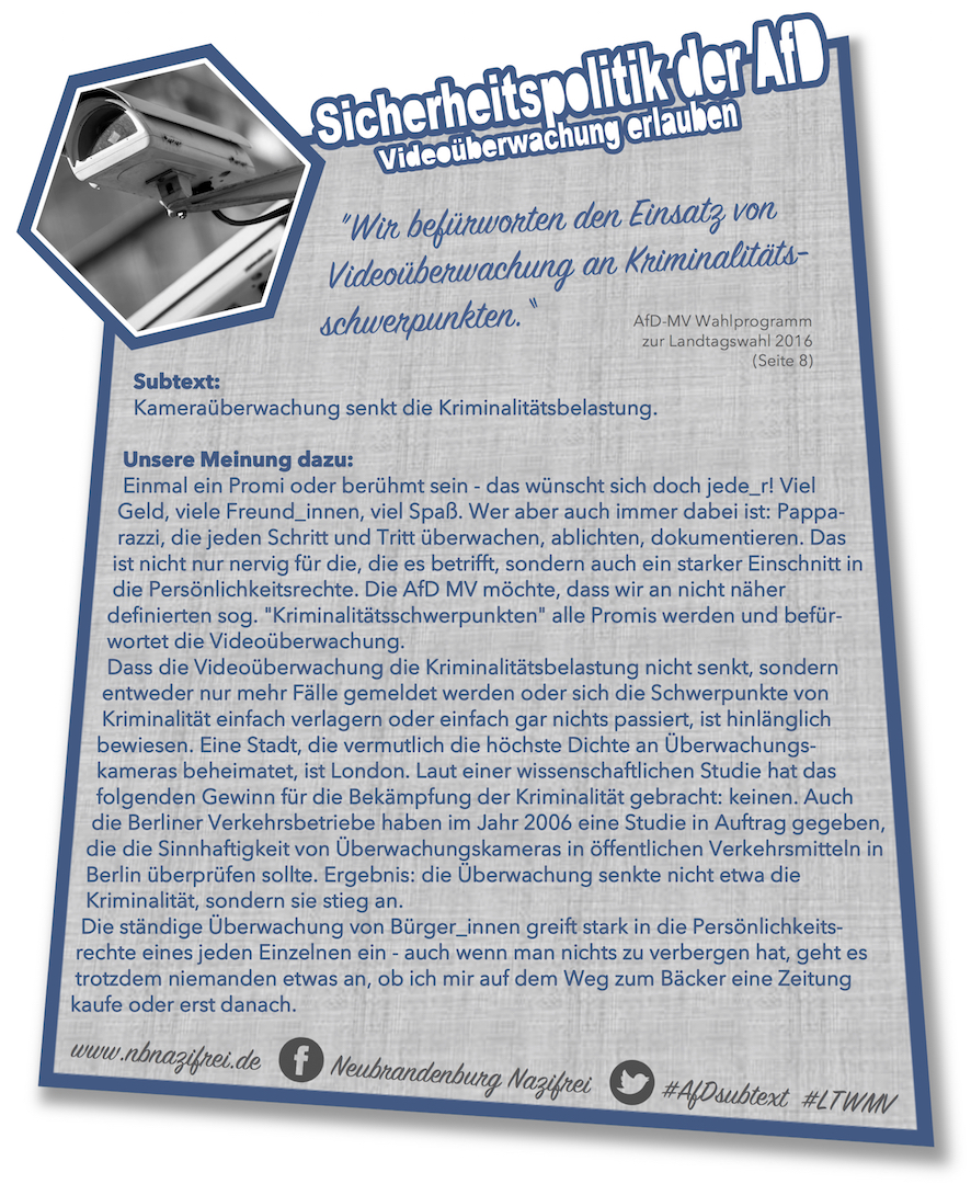 Wir haben uns mit dem Subtext im AfD MV Landtagswahlprogramm beschäftigt. Warum? In wenigen Wochen wählen die Einwohner_innen des Landes Mecklenburg-Vorpommern ihren 7. Landtag. Am 04. September entscheiden die Wähler_innen in Mecklenburg-Vorpommern, wer die nächsten fünf Jahre im Schweriner Schloss die Geschichte des Bundeslandes lenken wird. 2016 ist eine historisch relevante Wahl für Mecklenburg-Vorpommern: Nach 10 Jahren birgt sie erstmalig realisitisches Potential, dass die NPD nicht einzieht und damit in keinem Landtag der Bundesrepublik mehr vertreten ist. Gleichzeitig steht eine andere politische Kraft rechts von der CDU in den Startlöchern: die AfD, der auch in M-V aus dem Stand Rekordergebnisse von 19+-x% vorausgesagt werden. Was passiert eigentlich, wenn sich die Forderungen der AfD aus dem Landeswahlprogramm durchsetzen würden? Wir haben uns inhaltlich mit den Forderungen der AfD MV beschäftigt und werden in den kommenden Tagen bis zur Landtagswahl in unserer Reihe „SUBTEXT“ ausgewählte Punkte dokumentieren und kommentieren.