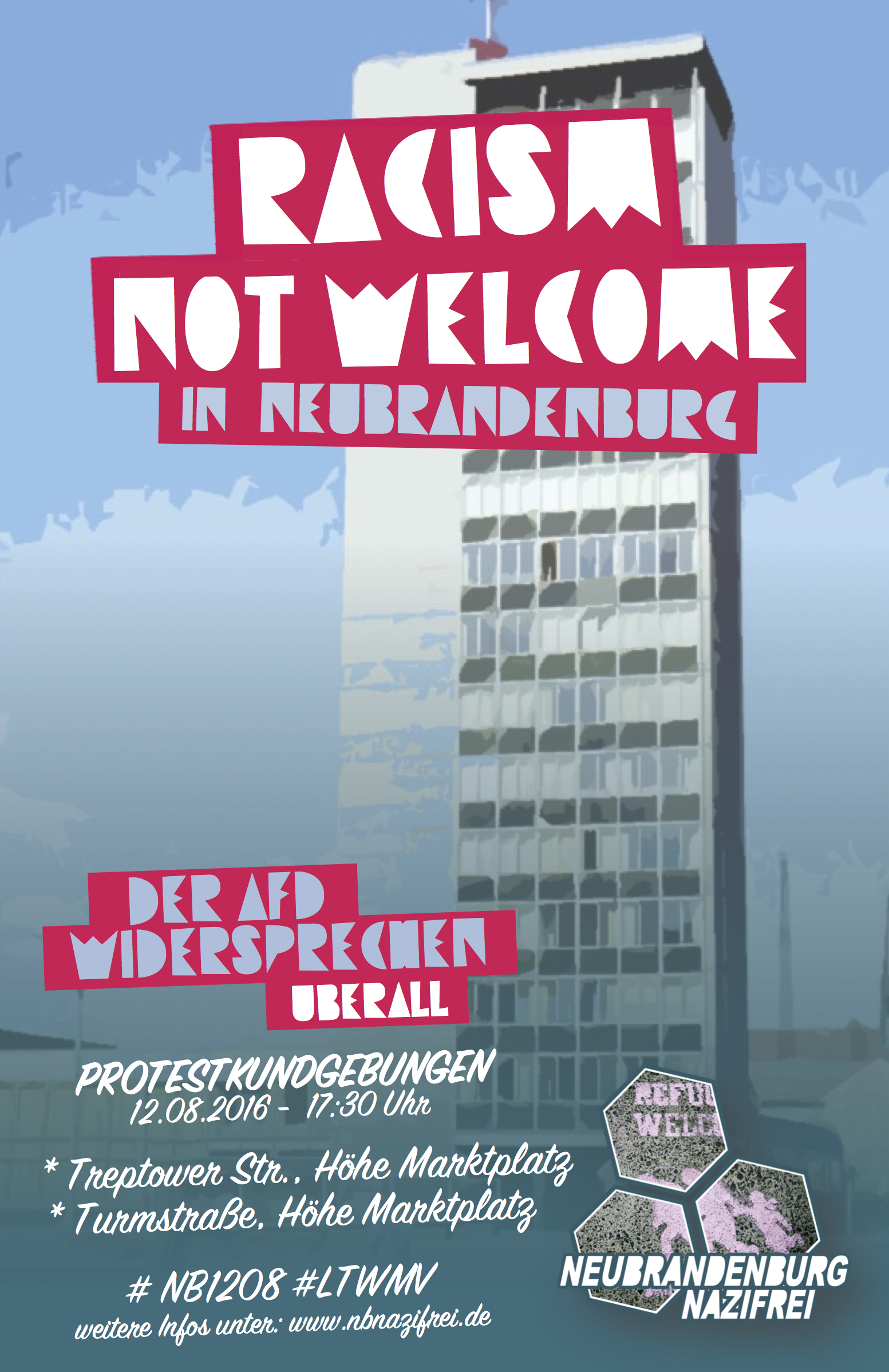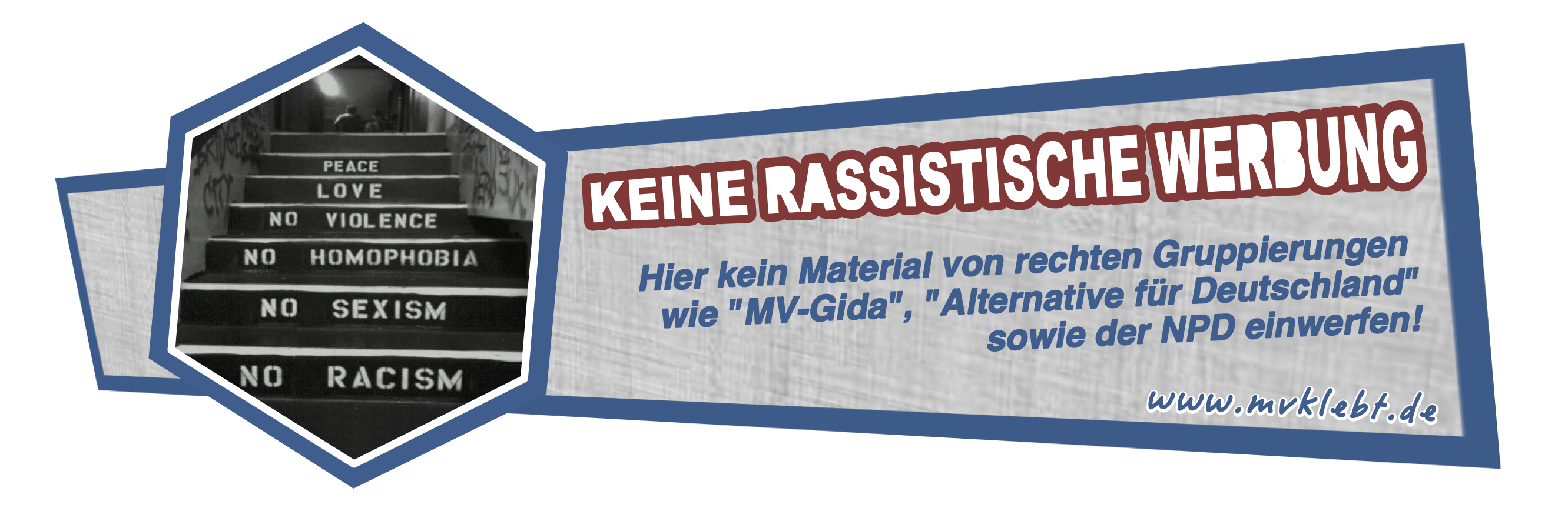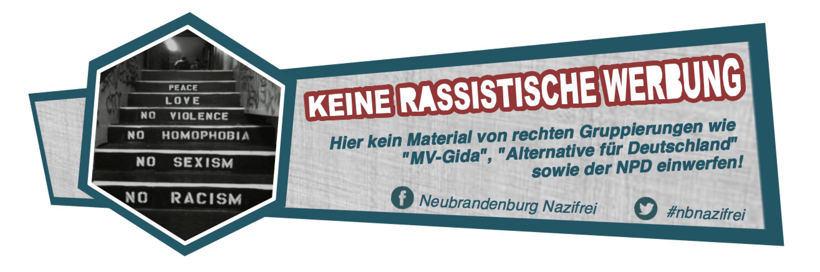 Am 20.07.2016 hat das Bündnis „Neubrandenburg Nazifrei!“ eine Kampagne gegen rechte Werbung in der Wahlkampfzeit ins Leben gerufen. Durch Platzierung von eigens erstellten Aufklebern auf dem heimischen Briefkasten sollen laut dem Bündnis AfD, NPD und MV-Gida davon abgehalten werden, Werbematerialien einzustecken. Ab sofort legt das Bündnis die Sticker an öffentlichen Orten in der Innenstadt, z.B. dem Foyercafé im Schauspielhaus oder dem Restaurant „Berlin“, zur kostenfreien Mitnahme aus. Außerdem steht der Sticker zum selbst-ausdrucken auf der Internetseite des Bündnisses zur Verfügung.
