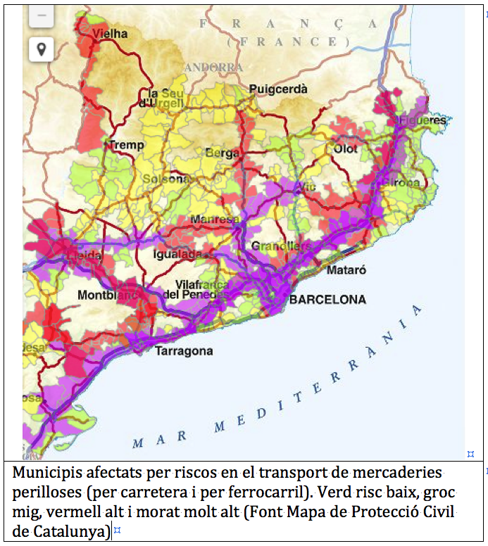 Aquestes fàbriques necessiten transportar la seva primera matèria per ferrocarril o per carretera per tant és perfectament plausible un accident com el de Ohio, al mapa de protecció civil podem clicar als riscos tecnològics l’apartat de risc transport mercaderies perilloses, i dins d’aquest apartat els de municipis amb risc viari i ferroviari, el resultat és el mapa que s’inclou…