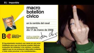 A Barcelona la convocatòria va ser a la Rambla del Rabal el 17/3 a la nit, va ser un dels pocs cassos en que havia una motivació social, el rebuig a la ordenança del civisme, un aparatós dispositiu policial va tancar el Raval, però en lloc de aturar el botellón va provocar nombrosos enfrontaments, van haver uns 57 detinguts i 64 ferits (registrats), els revoltats van atacar bancs, edificis públics i algunes botigues, els contenidors incendiats van malmetre algunes façanes (http://hemeroteca.lavanguardia.com/preview/2006/03/18/pagina-1/46943584/pdf.html )… Força significatiu és el fet de que el principal saqueig d’un comerç va ser en un supermercat de la Sirena, on sols es ven menjar, no articles de luxe, ni roba, ni electrònica.