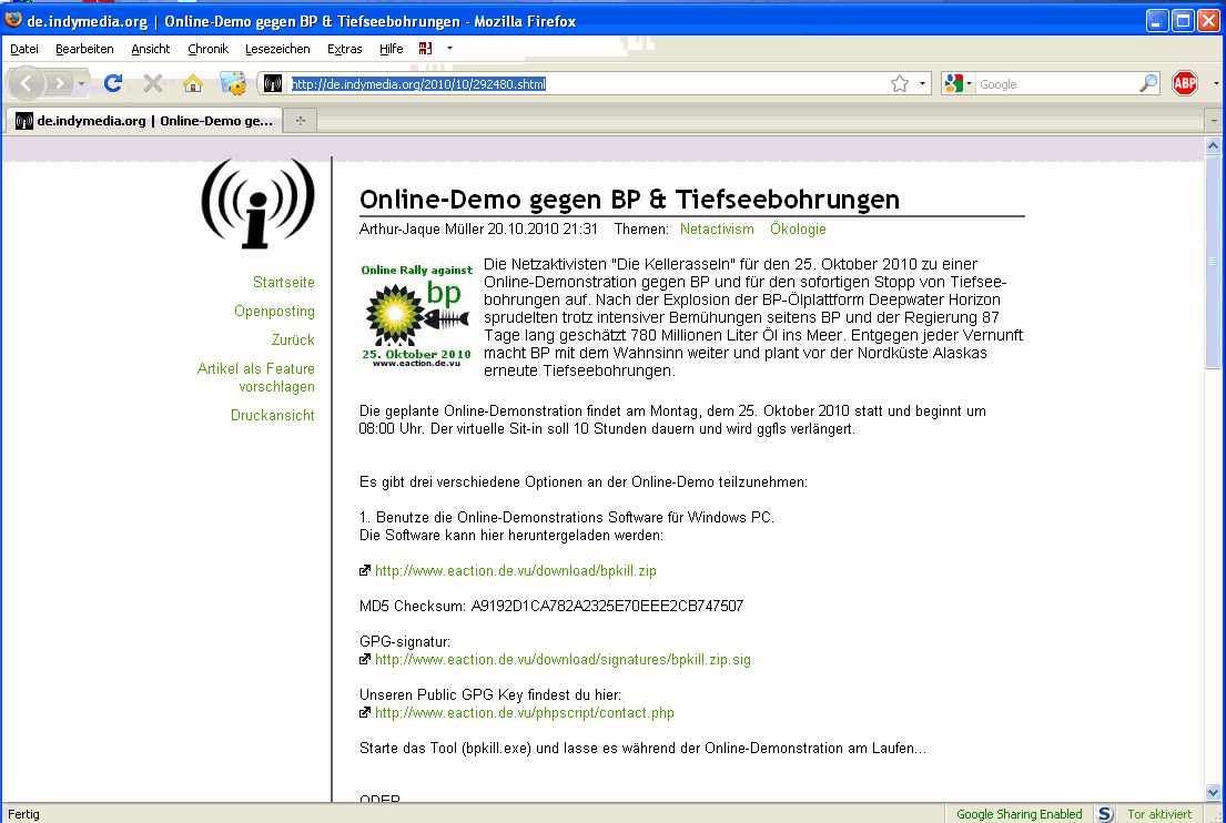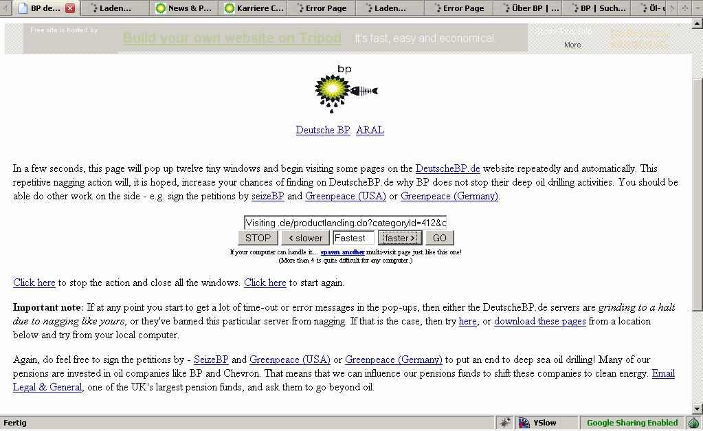 The online demonstration against ARAL and Deutsche BP was a success. Massive use of protest software and web-tools caused German BP servers to slow down.