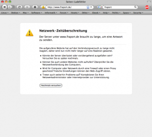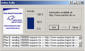 As in the previous online demonstration in 2005, everyone could join the online demonstration against Fraport. The most convenient way to take part was through a java-script html page in the browser. After pressing the „Start“ button, repeated requests were sent to the target, while it was still possible to do other things on the computer at the same time. An early version of the ZDEMO ATTAC software was also available in the protest. This tool with the name FRASTOP was based on the original Online Protest Software Kit, distributed for an online demonstration against lufthansa.com which took place on 20 June 2001. The 2009 event turned out to be the most popular online action of the net-activists „Die Kellerasseln“. Between 400 and 700 people took part in the Virtual Sit-In on January 12th.
