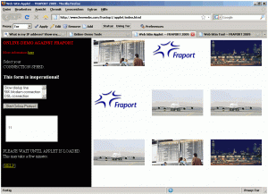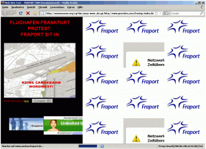 Comparable to this former online demonstration, everyone could take part in the virtual sitin at FRAPORT by just one mouse click. The organizers of this protest used the virtual sitin script of the Electrohippies (from UK) and the protest web page was hosted at a several public providers (Yahoo, Angelfire, Topcities).