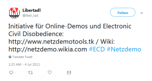 In this post we want to give a short overview of the Netzdemo Portal and our activities. We have now luckily reached a stable network of places and tools which together make up the Netzdemo Portal. First of all we are glad to have found Blackblogs.org as a friendly self-managed, non-commercial environment for this portal. Step by step we will move all contents related to online demonstration, virtual protest, netzdemo software, and news posts to this blog.
