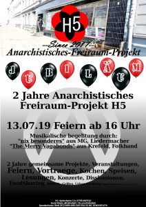 Am 13.07.2019 feiert das H5 in Krefeld sein 2 Jähriges bestehen. Auf der Soliparty beglücke ich euch musikalisch zusammen mit "The Merry Vegabound". Am 26.10.19 spiele ich auf meiner Gitarre auf der Soliparty der Anarchosyndikalistischer Basisgewerkschaft FAU-Kr (Freie Arbeiterinnen Union) Kommt Zahlreich, unterstützt und habt Spaß Das Freiraumprojekt H5 in Krefeld, veranstaltet eine Soliparty um die Kasse aufzufüllen. Ich trette hier als Liedermacher auf. Kommt Zahlreich, habt Spaß und feiert.
