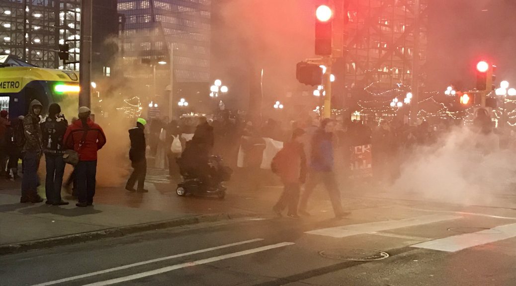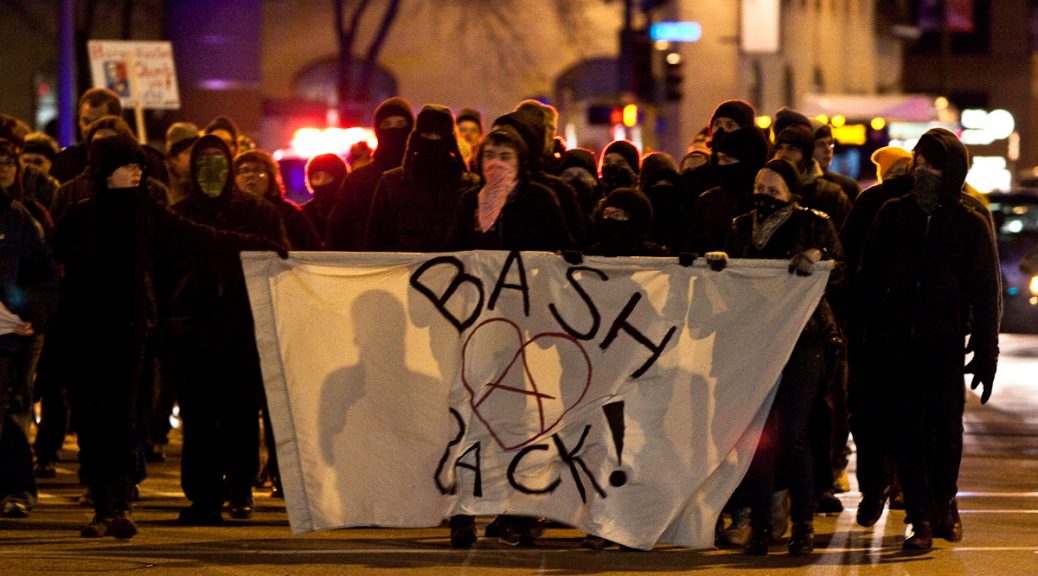 On January 20th, 2017 perhaps a thousand people marched from south Minneapolis to downtown against Trump’s inauguration. The night before, posters were wheatpasted along the route of the march with anti-state messages that interrupted the prevalent narrative that Trump was to blame rather than the whole system. After the mass march concluded in front of the county building, some came together on the light rail tracks and began shooting off fireworks, drawing in more and more people bored by the politicians’ speechifying before deciding to march. The crowd shot off more fireworks at the youth jail and vandalized the nearby Wells Fargo headquarters before quietly dispersing. By all accounts, there was no one in charge, just a convergence of affinity groups who each brought their own goals and contributions—fireworks, banners, spray paint, a sound system, etc—together forming a successful action.