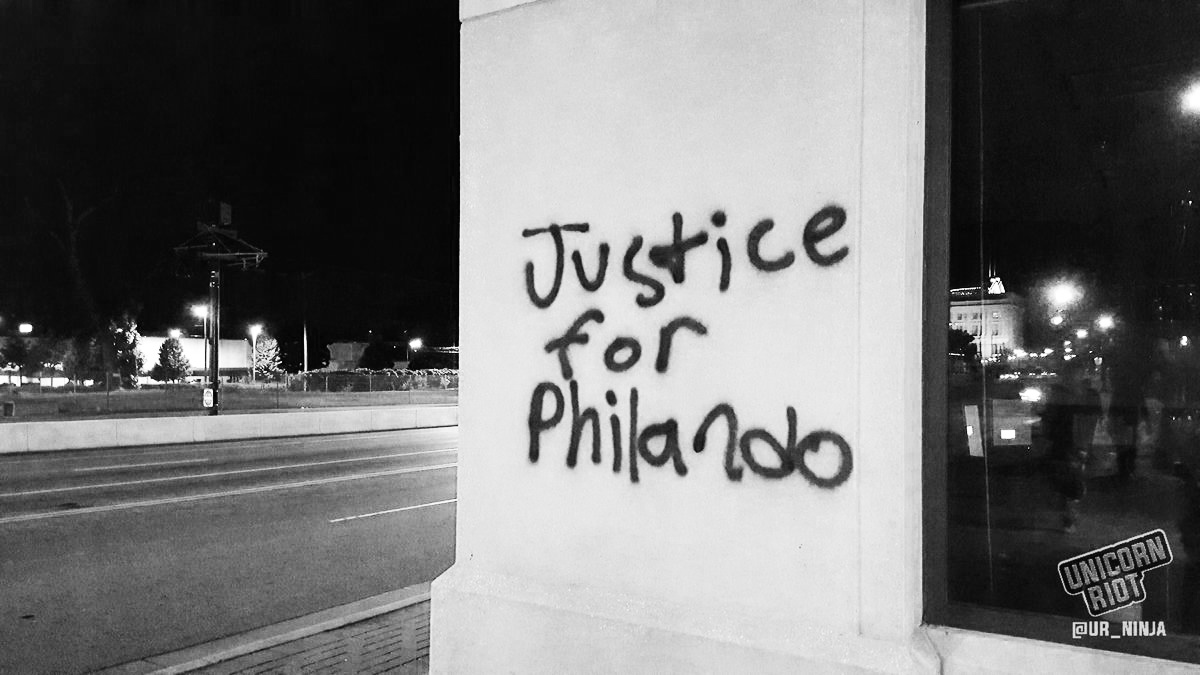 Accusations of “violence” flew, along with claims that “that’s not what this is about,” even after Valerie Castile explicitly called for people to express their anger in whichever manner their heart desired. People donning masks in order to avoid further police repression and information doxxing by the far-right were called “cowards” and “instigators”. It almost seemed like these people had forgotten that a man’s life was taken by the state, and that earlier that day it had been made clear that officers who do the same thing in the future will not be punished. But somehow writing on a traffic sign to remember and avenge Philando Castile is considered “violence”.