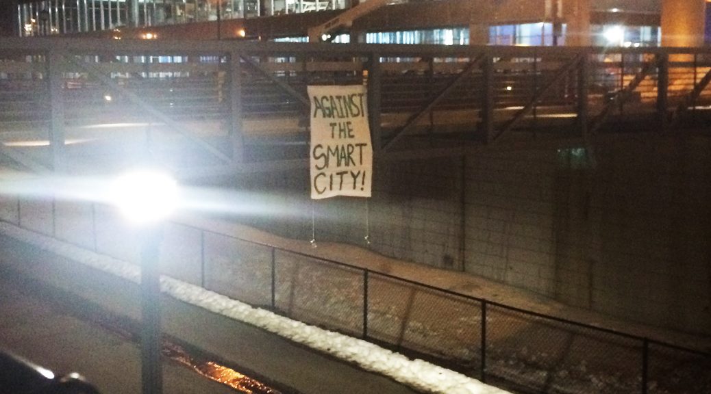 This action resonates strongly with us, so we’re using it as a starting point to elaborate this rallying cry, against the smart city. In the words of the anonymous communique, originally submitted to Conflict MN: