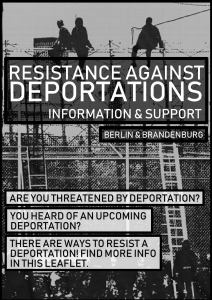 Ein neuer Flyer stellt potenzielle Taktiken vor, mit denen gegen die eigene Abschiebung Widerstand geleistet werden kann. Droht dir eine Abschiebung? Hast du von einer bevorstehenden Abschiebung gehört? Es gibt Wege, sich der Abschiebung zu widersetzen! Du findest genaueres in diesem Flyer. Es gibt diesen Info-Flyer in diesen Sprachen (PDF): Urdu-اردو, Tigrinya-ትግርኛ, Serbian-Српски, Pashto-پښتو, Russian-русский, Farsi-فارسی, French-Français, English, Arabic-عربى, German-Deutsch