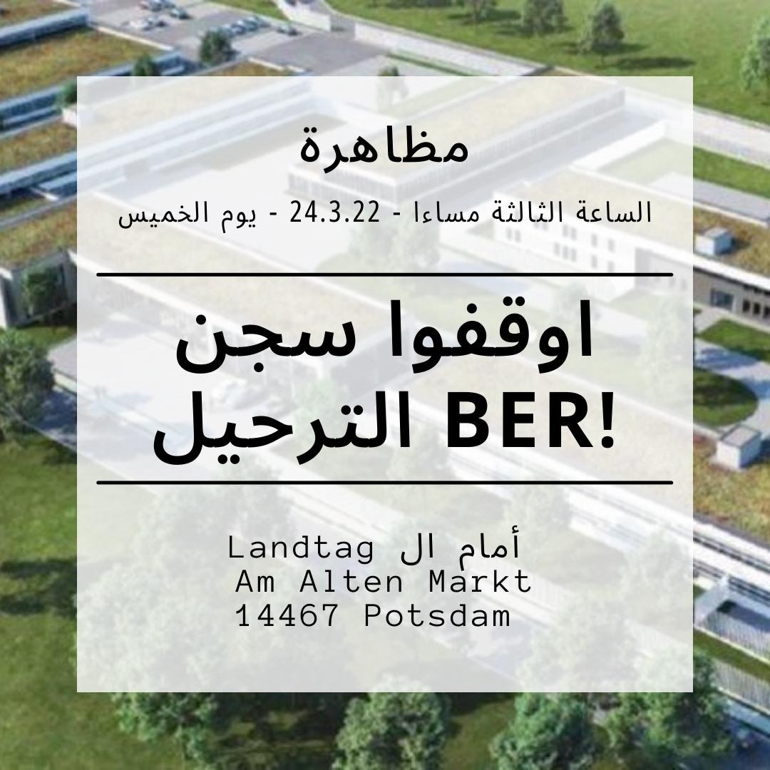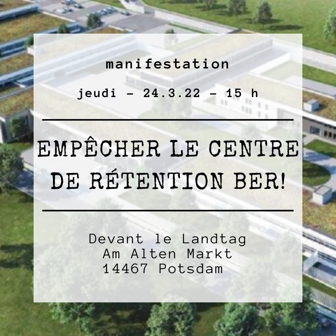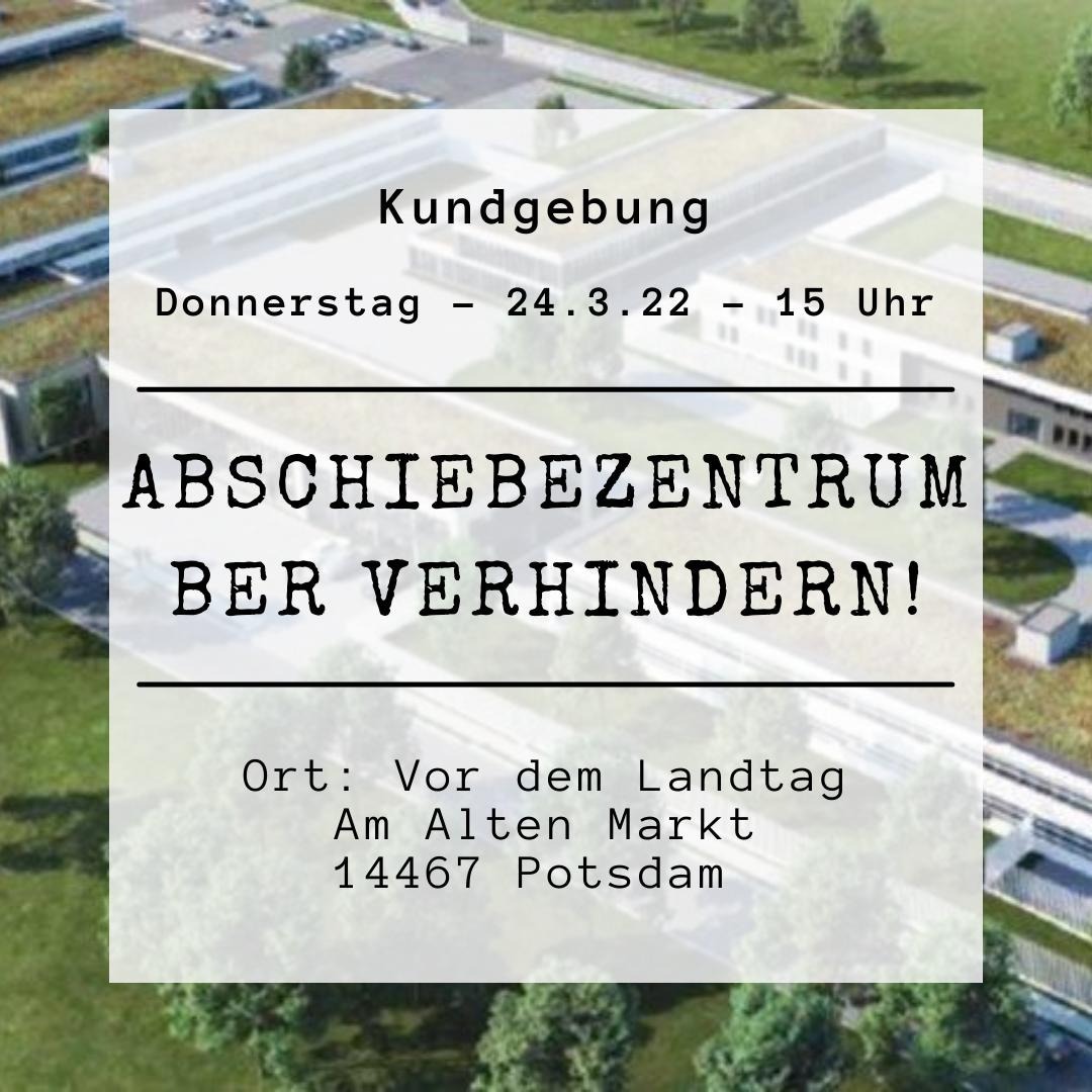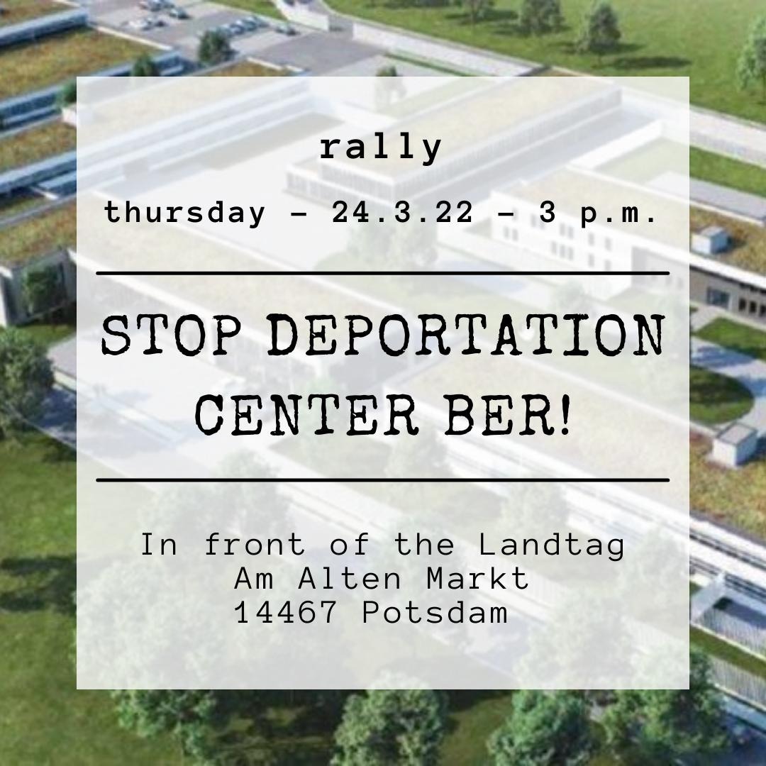 Germany is planning a new deportation center at BER airport. This Thursday, these plans will be discussed in Brandenburg parliament in Potsdam. The alliance “Abschiebezentrum BER verhindern” calls to gather at the parliament building during their session and raise our voice: Stop the construction of this deportation center!