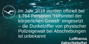 Das Geschäft mit Abschiebungen muss als das entlarvt werden, was es ist: rücksichtslose Komplizenschaft mit kolonialer und rassistischer staatlicher Gewalt. Niemand verdient es, in Abschiebeflugzeuge gezwungen zu werden. Fliegen sollte eine freiwillige Entscheidung für alle sein. Und es ist die Wahl der Lufthansa-Chefs, ob sie weiterhin an dieser kolonialen Ungerechtigkeit mitarbeiten oder ob sie sich gegen Rassismus stellen und ihr Geschäft mit Abschiebungen einstellen.