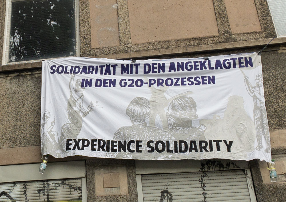 Nach dem Gipfel waren es vor allem Aktivist*innen ohne deutschen Pass, die mit der Begründung einer möglichen Fluchtgefahr länger in Untersuchungshaft saßen. So waren sie es auch, die die ersten Prozesse über sich ergehen lassen mussten. Entsprechend der beschriebenen Stimmung nach dem Gipfel waren die Strafmaße exorbitant hoch. Zum Beispiel wurde der junge Niederländer Peike Ende August 2017 für zwei Flaschenwürfe, deren einziger Beleg in der zweifelhaften Aussage der ihn festnehmenden Beamt*innen bestand, zu 2 Jahren und 7 Monaten Knast verurteilt. In den folgenden Berufungen wurden einige Urteile etwas abgemildert. Einen Effekt hatte das aber vor allem für die Wahrnehmung, dass die immer noch krassen Strafen als nicht mehr ‚ganz so schlimm‘ erschienen.