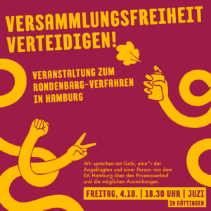 Geben wir uns keinen Illusionen hin, im Strafrecht geht beim Landfriedensbruch auch so schon ne ganze Menge. So reicht zum Beispiel unterstützendes Rufen bereits jetzt für eine Verurteilung aus. Wenn hier aber ein Präzedenzfall für die Anwendung des Hooligan-Urteils auf Demonstrationen geschaffen wird, braucht es zukünftig überhaupt keinen Nachweis einer individuellen Handlung mehr. Dann reicht es, irgendwo gewesen zu sein, um für alles während und nach Verlassen des Geschehens verantwortlich gemacht werden zu können.