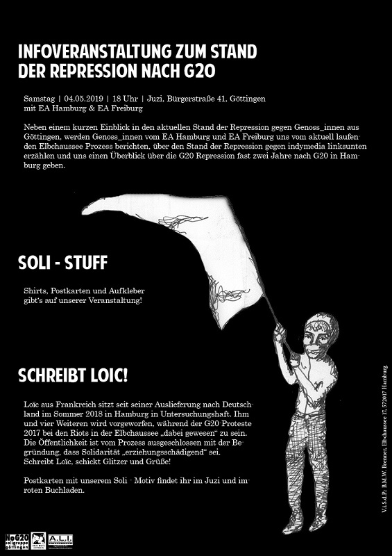 Drei Jahre nach dem G20-Gipfel in Hamburg sollen am 10. Juli 2020 die Urteile im Elbchaussee-Prozess fallen. Nachdem über 18 Monate unter Ausschluss der Öffentlichkeit gegen fünf Genossen verhandelt wurde, wird der Prozess mit einer Erklärung von Loic und den Plädoyers von Staatsanwaltschaft und Anwält*innen ab dem 17.6. wieder öffentlich. Die Absurdität des ganzen Schauspiels wird vor dem Hintergrund deutlich, dass vier der fünf Angeklagten keine eigenhändige Straftat vorgeworfen wird. Sie sollen also exemplarisch bestraft werden: als Rache für den verpatzen Gipfel und mit der Hoffnung, andere Aktivist*innen abzuschrecken.