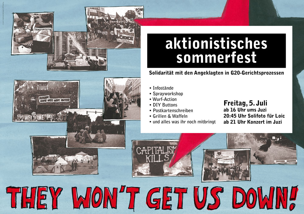 Damit wird ein weiteres Mal versucht, den Protesten um den G20-Gipfel ihren politischen Charakter abzusprechen. Wir waren in Hamburg aus Gründen – und würden es wieder tun! Wir wehren uns gegen den Versuch, über eine Entpolitisierung eine kollektive Haftung für Demonstrationen zu konstruieren und die unterschiedlichen Protestformen in „gut“ und „böse“ zu spalten. Dem Versuch, über die drakonische Bestrafung einzelner eine ganze Bewegung einzuschüchtern, setzen wir unsere Solidarität entgegen. Unsere Solidarität gilt allen Beteiligten und von Repression Betroffenen, egal was sie nach den Anschuldigungen vor Gericht gemacht haben sollen. Solidarität ist unteilbar!