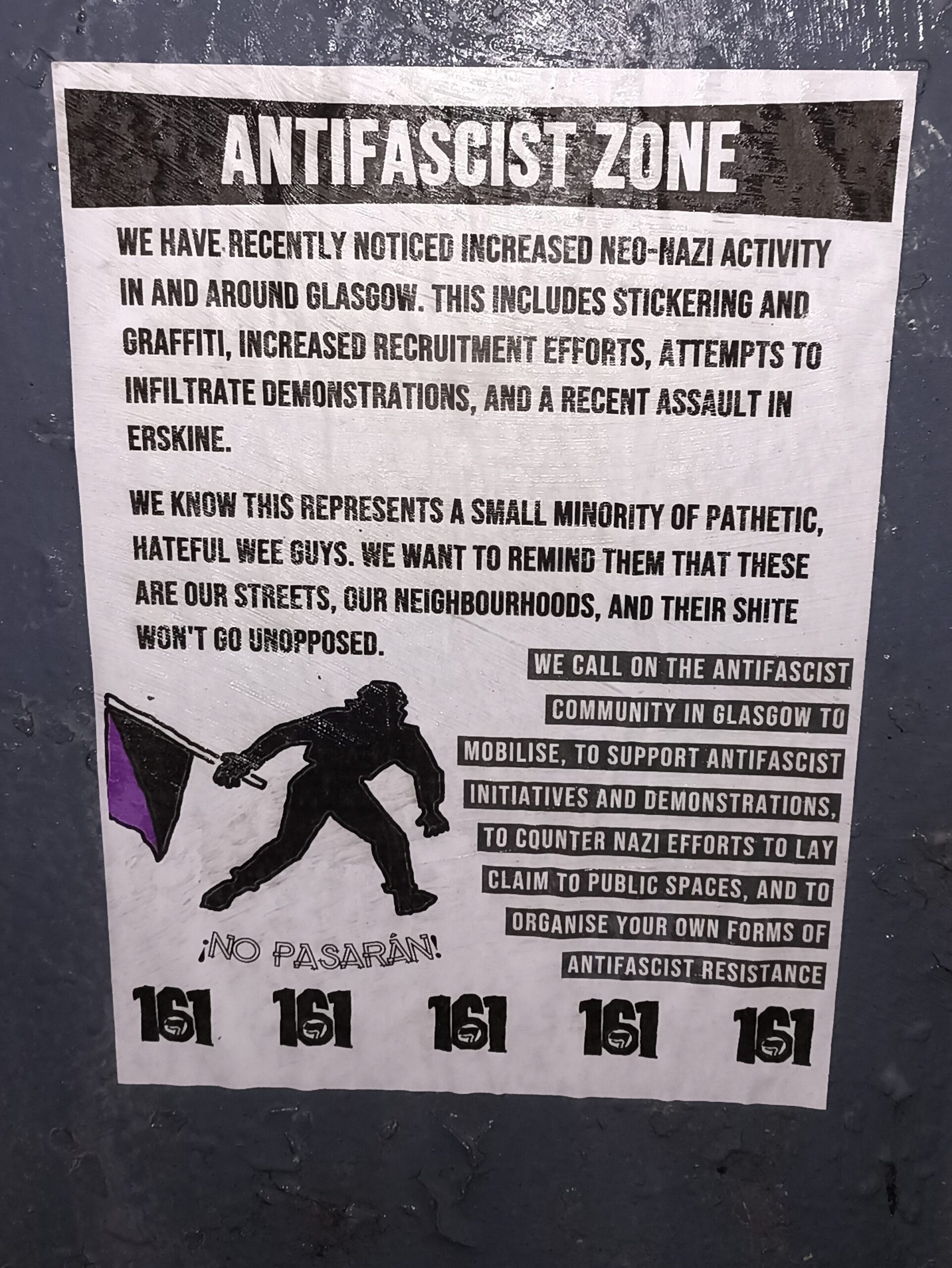 Antifascist Zone – We have recently noticed increased neo-nazi activity in and around Glasgow. This includes stickering and graffiti, increased recruitment efforts, attempts to infiltrate demonstrations, and a recent assault in Erskine.