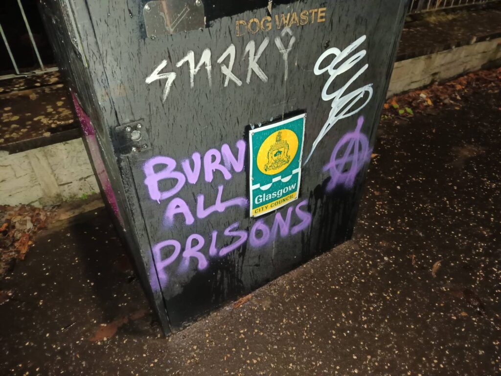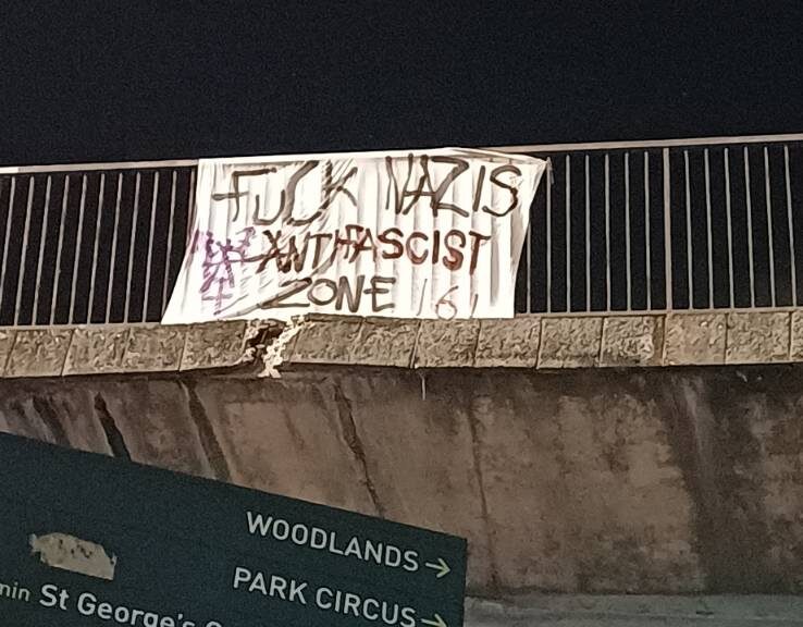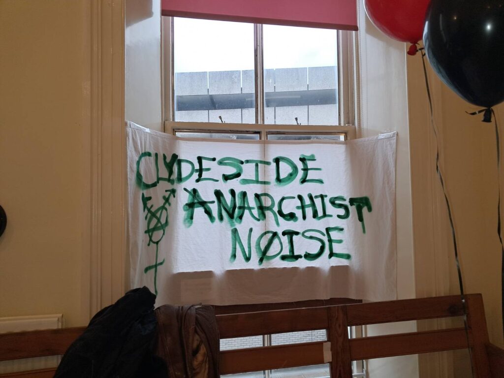 On the same night, anarchists in Glasgow put up a banner in Govanhill reading: