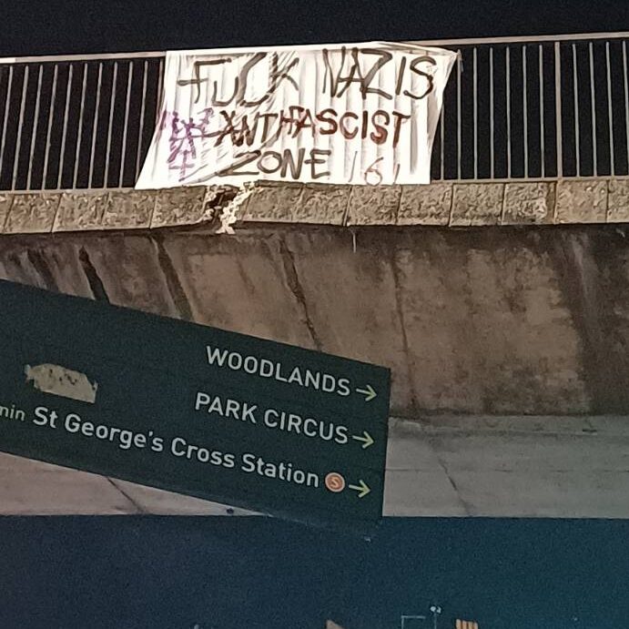 In a night of action in Glasgow’s West End, antifascists put up dozens of posters and dropped two banners; one over the M8 (FUCK NAZIS) and one on Woodlands Rd (Dinnae Be Fash).