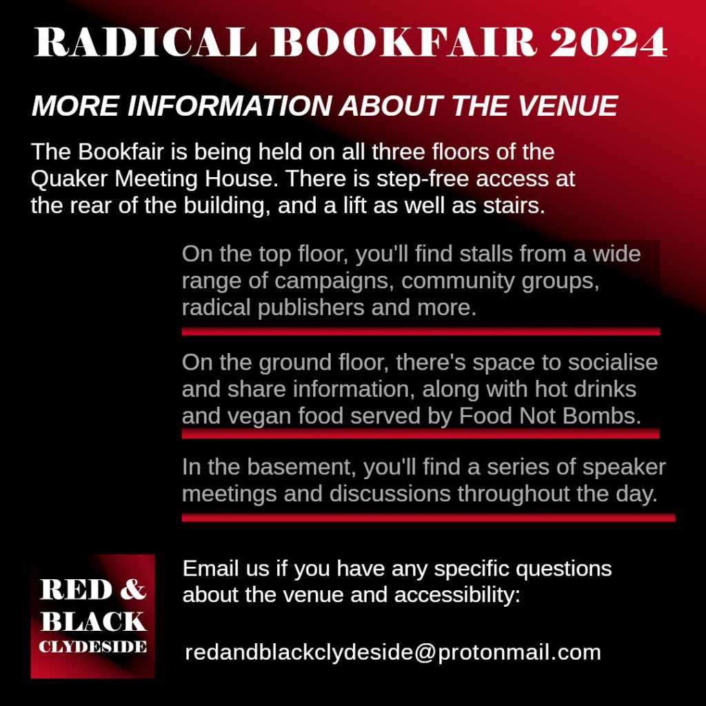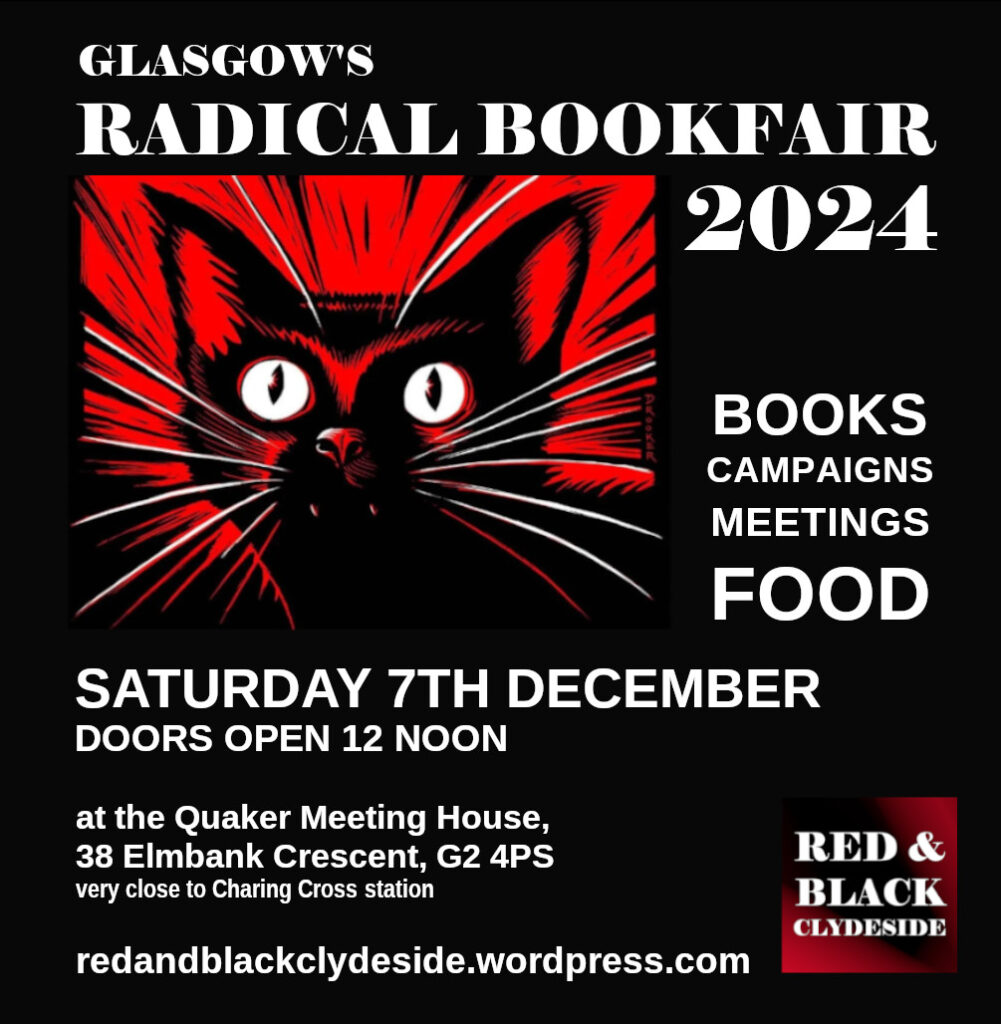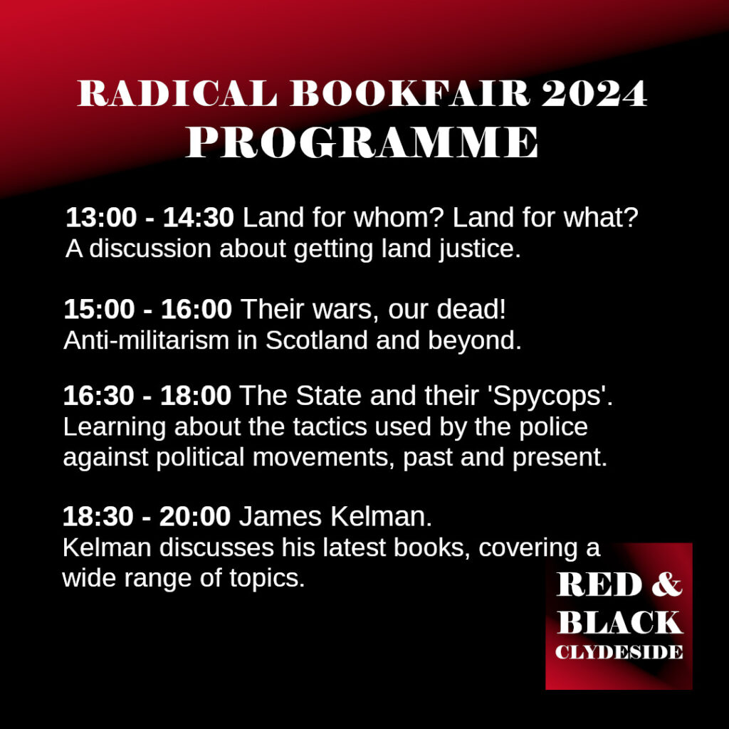 There will be stalls by other groups, free vegan food from Govanhill Food not Bombs, as well as a number of interesting discussions. More information on the Radical Bookfair on the Red & Black Clydeside website, as well as in the images below: