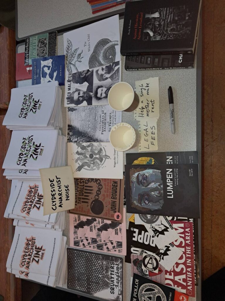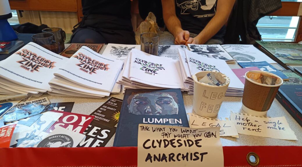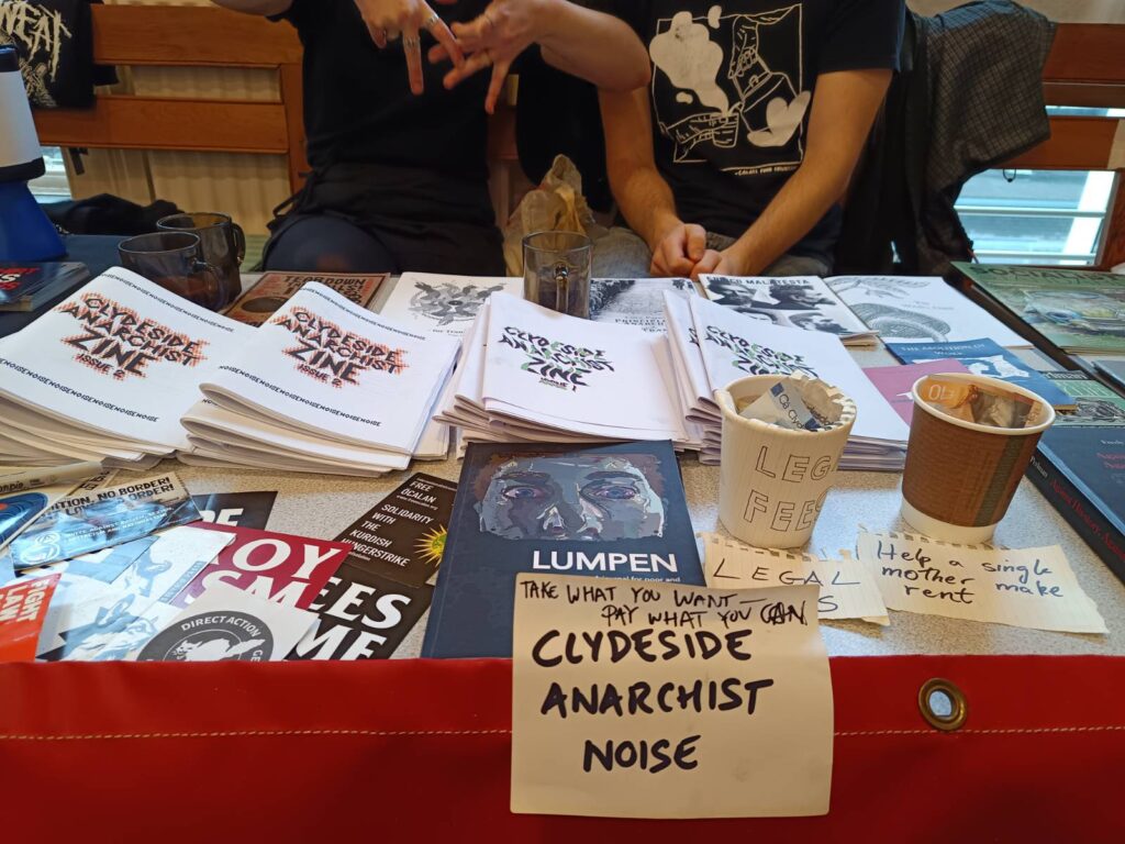 On Saturday 7 December, Clydeside Anarchist Noise sent a delegation of rabble-rousers to the Glasgow Radical Bookfair, at the Quaker House. We handed out loads of our zines (and ran out – possibly slightly too early!), participated in the discussions, chatted to comrades from across the anarchist scene in Scotland, and made loads of new pals! Additionally, we were able to raise some money for legal fees and to help a single mother pay her rent this month – thank you to everyone who contributed to these efforts.