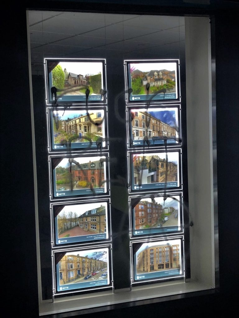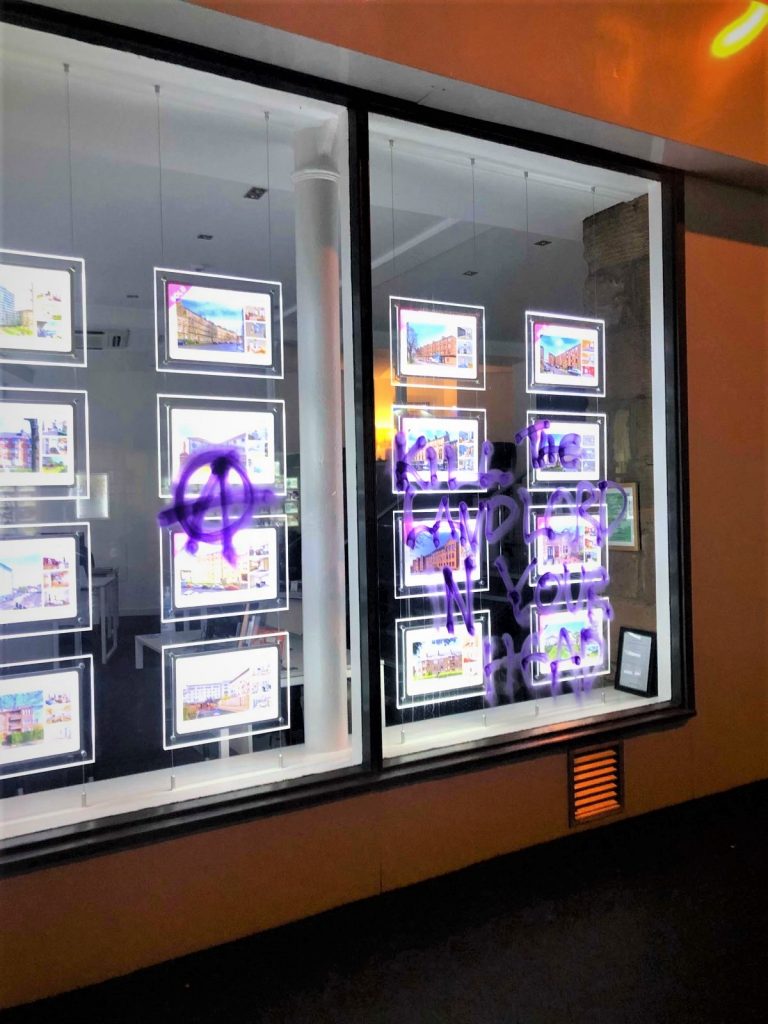 Thus, on the 1st of May 2022, 136 years after the Haymarket affair, we chose not to join the yearly demonstration of the decaying left, where the same people march through the same roads, shouting the same chants, a slight bit weaker each time. Instead, we chose life, joy and action over mere survival, returning to a miniscule extent the harm caused to our communities by defacing the facades of the following targets on Byres Road, in the West End of Glasgow: