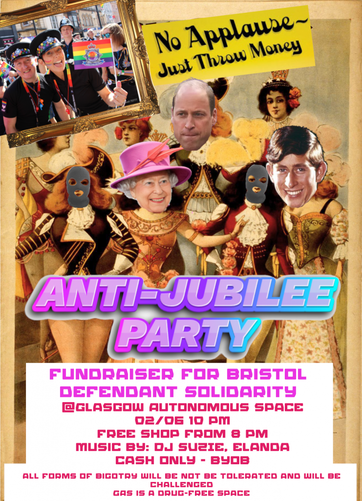 We refuse to stand idly be as this archaic system of oppression is celebrated and perpetuated. The UK capitalist state is based on dispossession of the commons and colonial plunder, with the monarchy being the most egregious and obvious example. In Scotland, half of rural land is owned by 432 landowners, whilst everyone else spends most of their working lives exploited at work, paying off a debt on a small patch of land which is barely enough to accommodate a dwelling, if they can even get a mortgage at all. The capitalist state system is driving us towards extinction due to ecological collapse – we must radically transform our social and economic system before it’s too late.