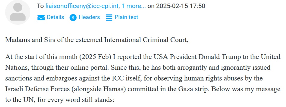 I just launched this email to the office of spokesperson for the International Criminal Court, as well as to the UN liaison for the ICC.