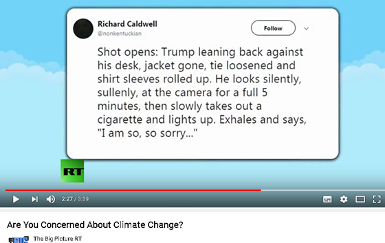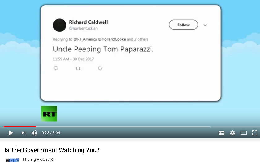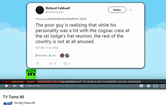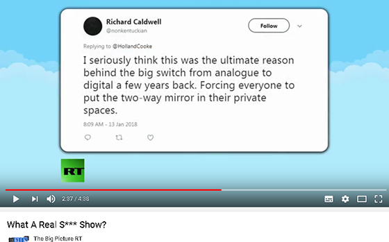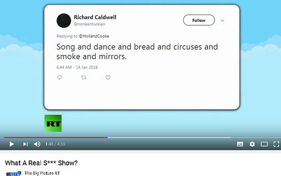 Earlier this year, my last twitter account was quoted on-air by Holland Cooke during episodes of his The Big Picture program, broadcast on RT America. I never kept more than 2 or 3 dozen followers, yet my page-views easily averaged at around 20000 per day, so I was used to unannounced eyes on me. But he quoted me 5 times across four episodes, with appropriate screen-grabs, and while I’ve no idea if it were interns or producers who stumbled across my account, the overall experience provided a strange signal boost. At no point did I ever exchange communication directly with Holland or anybody remotely affiliated with his show, not even through direct messaging at twitter.