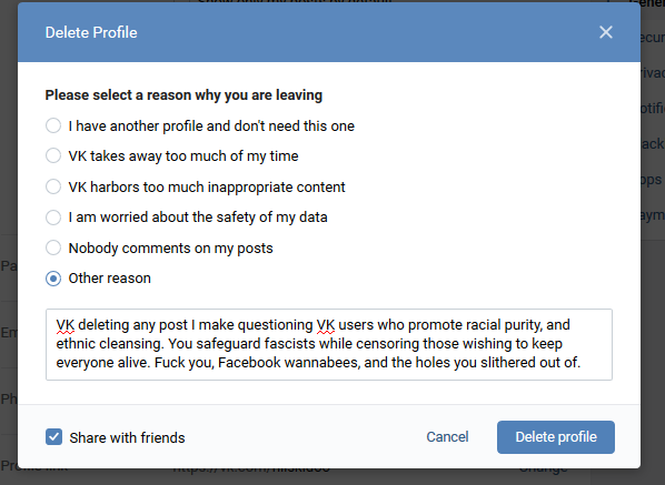 This as but one of several examples noticeably was not calling out anyone or any one community, but instead fairly diplomatically questioning ideologies which just so happened to be prevalent therein at VK. Along with quite a lot of porn, strangely, with nary a filter to be found. But following the sudden uptick in my deletions of the last day and after exchanging webmail addresses with wizened parties, I made the decision to brazenly do this: