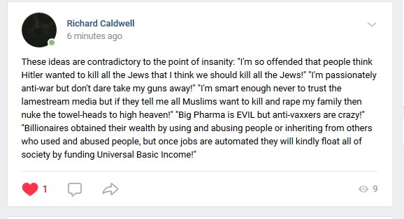 Unfortunately, miserably, vastly outnumbering those like-minded, disenfranchised voices exists entire communities (the VK equivalent of Facebook’s pages or groups) focused entirely on the seething prejudice and unfiltered animosity of Zionist, Neo-Nazi circle-jerking. So, a sizable portion of the comments I left on the posts of others were questioning the logic of such contrarians, responding to their calls for widescreen purging with rational statements along the lines of “As far as superiority goes, in genetics, the opposite of diversity is inbreeding.” And thusly, every single post of mine erased by forces beyond my control were those opposing these racist cowards. One post in particular, which I reposted from memory with rewording a second and third time after others noticed its continuing absence from their feeds, attempted to convey the irrationality of genocide. Essentially, I wrote that many Americans despise their own leadership, many Russians despise their own leadership, just as many Jews despise the Israeli state, as most of the people of the Earth are similar in being more focused with fretting over keeping their lights on and finding somebody to love than with genocide. And, that wiping out an entire peoples for the fallacies of its leadership is no different from bombing a church to take down the pedophile pastor inside, because it kills the biggest victims of the perpetrator in the doing. Which is completely fucking true. But which met with such vitriolic bile by so many brave Nordic warriors and the like as to prompt this post, which did not last a full day: