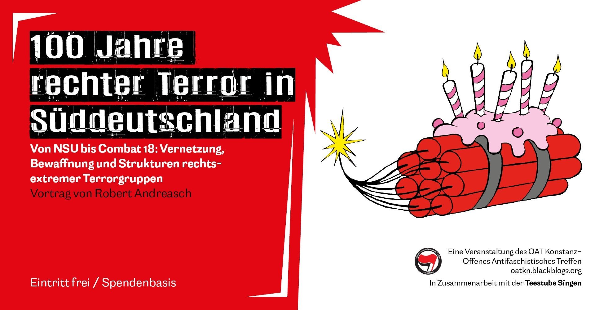 Robert Andreasch erzählt die einhundertjährige Geschichte rechtsterroristischer Gruppen, Netzwerke und Täter_innen in Süddeutschland, von der „Thule-Gesellschaft“ über die „Kabus-Gruppe“, die Wehrsportsgruppen, die „Deutschen Aktionsgruppen“ über den NSU bis zu den Netzwerken von „Combat 18“ und „Südkreuz“. Wie konnten die Attentate jeweils so schnell wieder in Vergessenheit geraten? Welche politischen Kampagnen von rechts wurden und werden durch Anschläge begleitet und warum? Welche Konzepte des bewaffneten Kampfes wurden und werden in den hiesigen rechten Szenen diskutiert und umgesetzt? Wie sahen und sehen die gesellschaftlichen Bedingungen jeweils aus?