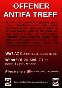 Am 24. Mai 2022 (Dienstag) findet ab 17 Uhr die 1. Veranstaltung des neuen Offenen Antifa Treff Dresden im AZ Conni statt. Die Veranstaltung richtet sich an all die jenigen, die in Dresden antifaschistisch aktiv werden wollen und noch nicht richtig wissen wohin. Wir wollen einmal im Monat einen Raum bieten, um in entspannter Antmosphäre über Antifa und das ganze drum herum ins Gespräch zu kommen – ihr braucht keine Vorkenntnisse oder ähnliches mitzubringen. Für inhaltliches Rahmenprogramm (Vorträge, Filme, Infoecke, …) sorgen wir, außerdem gibt’s warmes Essen und die Bar ist die ganze Zeit offen. Die Veranstaltung soll keinen Politgruppencharakter haben, sondern ein offener Treff sein, zu dem jede:r kommen kann, ohne sich unbedingt an etwas beteiligen zu müssen. Ihr könnt den Vorträgen / Mobiveranstaltungen … zuhören, aber auch einfach mit euren Freund:innen an der Bar oder im Hof sitzen. Der Treff soll als Anlaufpunkt dienen, um mit Menschen, die auch antifaschistisch aktiv werden wollen, ins Gespräch zu kommen und als Organisierungshilfe dienen.