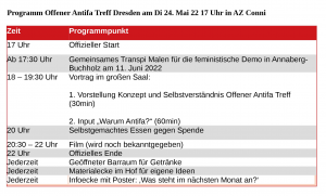 Für mehr Infos zu Programm und allem weiteren folgt uns auf Insta unter @offener_antifa_treff_dresden