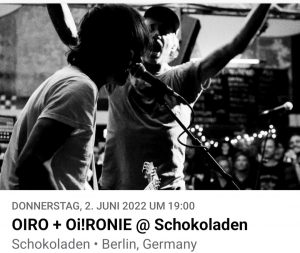 Uncategorized Diesen Donnerstag: 30. May 2022 oironie OIRO und Oi!RONIE im Schokoladen. Einlass ist 19 Uhr. Tickets gibt es hier. . Oi!